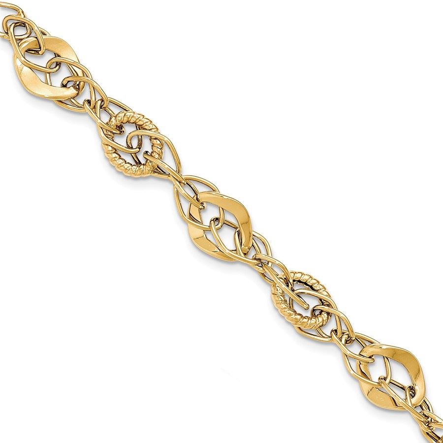 14k Solid Gold Polished Textured Fancy Link Bracelet