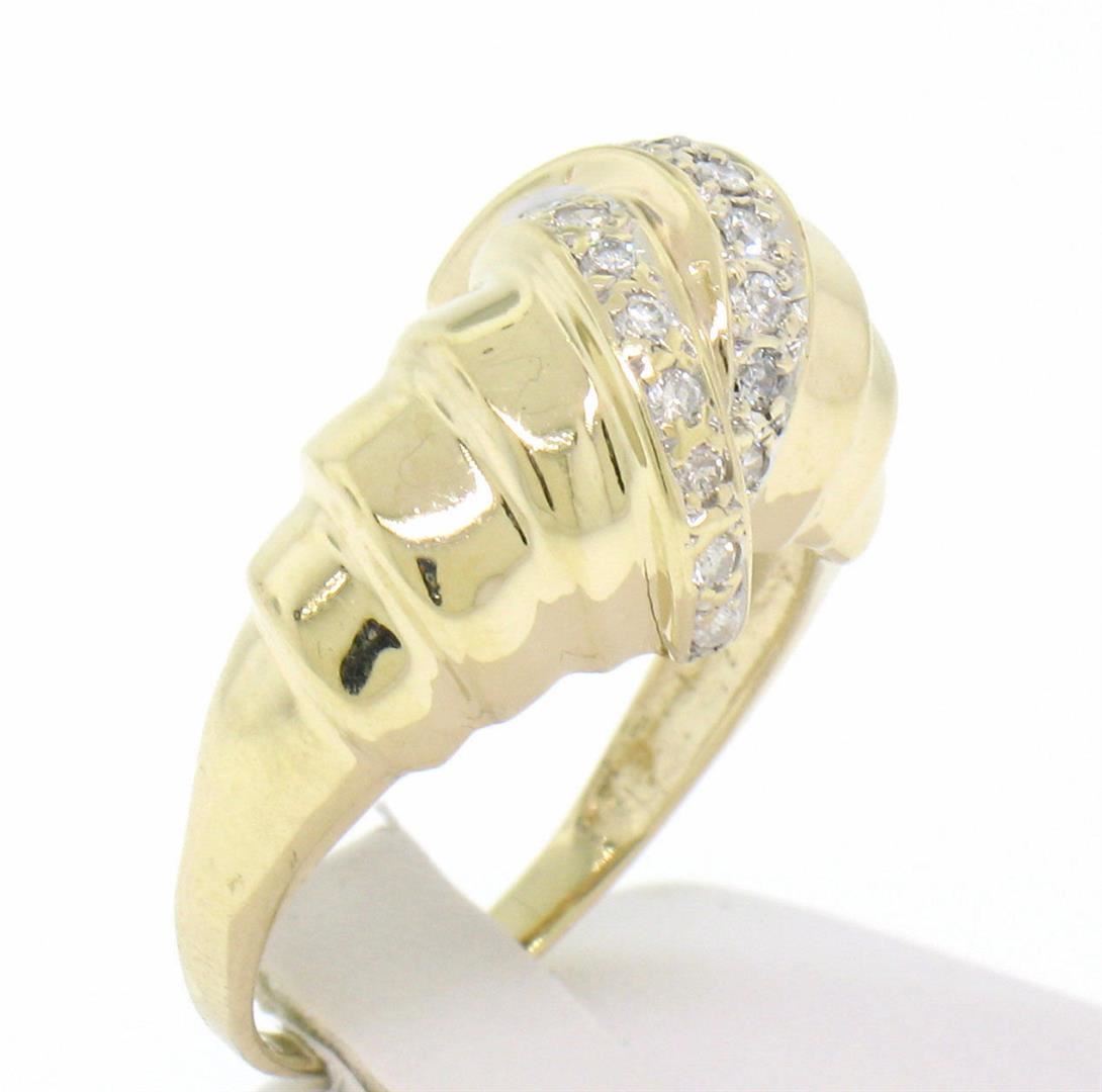 An estate solid 14k yellow gold french twist cocktail ring, featuring 18 round brilliant cut natural diamonds ( H - SI1; 0.25ctw). The ring is size 6.0, weighs a total of 4.80 grams, and measures 11.27mm wide.