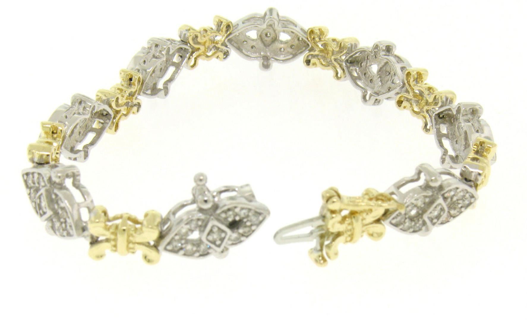 One 14k Solid Two Tone Gold Diamond Drenched 3.29ctw UNIQUE Link Bracelet. Item Details: Material: 14k Solid White and Yellow Gold, Weight: 24.60 Grams, Stone: (88) Natural Genuine Diamonds - Round Brilliant Cut - Prong Set - H/I Color - VS2/SI1 Clarity - 3.29ctw (approx.), Clasp: Push clasp with safety latch, Dimensions: Bracelet measures approx. 11mm wide at its widest. It is 7.50in. long, Condition: Like New!