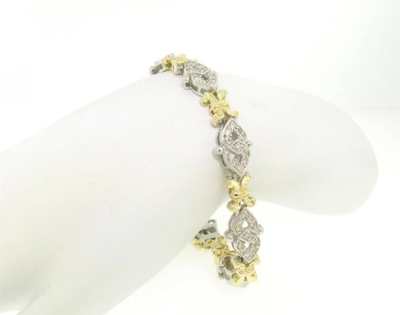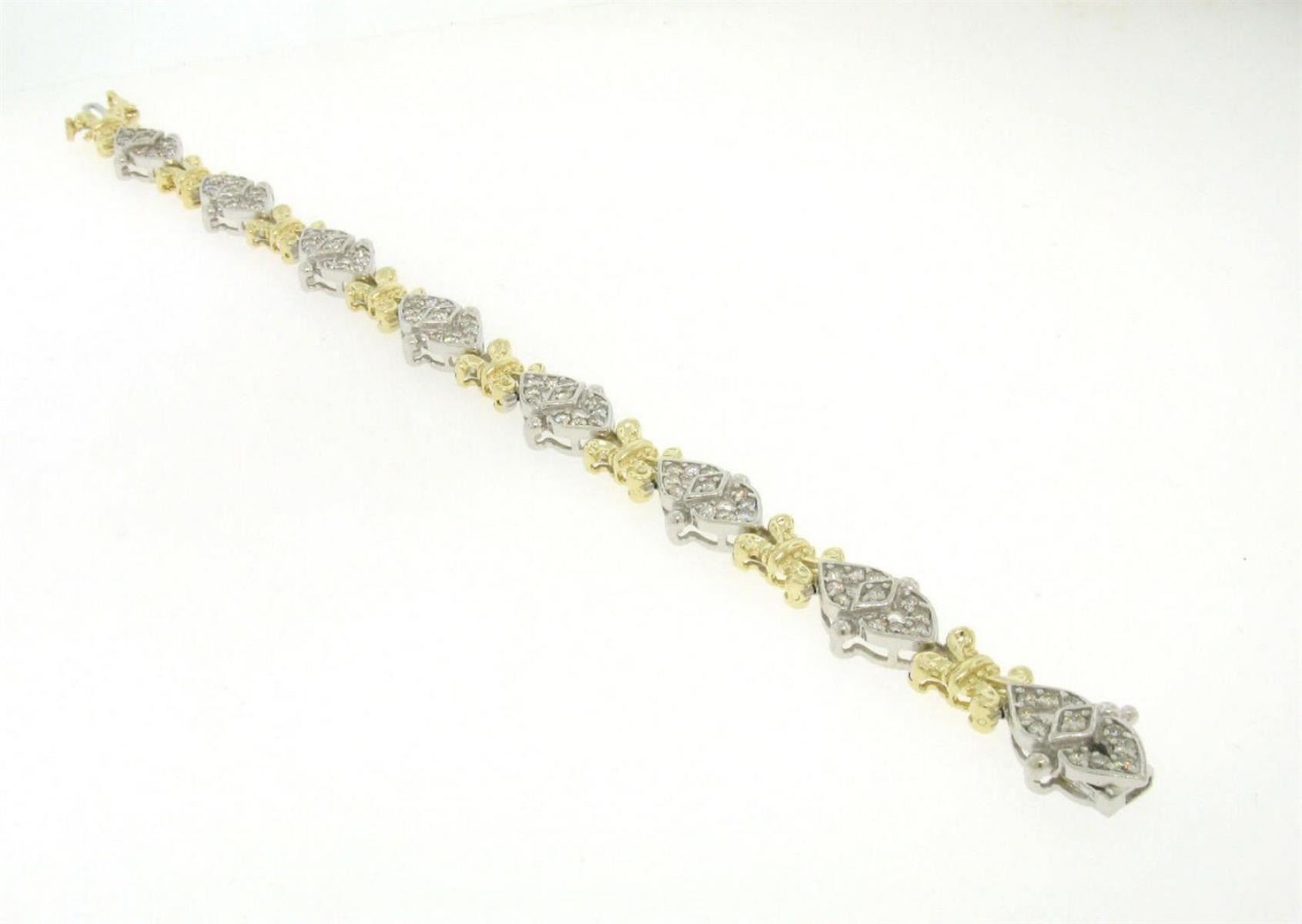One 14k Solid Two Tone Gold Diamond Drenched 3.29ctw UNIQUE Link Bracelet. Item Details: Material: 14k Solid White and Yellow Gold, Weight: 24.60 Grams, Stone: (88) Natural Genuine Diamonds - Round Brilliant Cut - Prong Set - H/I Color - VS2/SI1 Clarity - 3.29ctw (approx.), Clasp: Push clasp with safety latch, Dimensions: Bracelet measures approx. 11mm wide at its widest. It is 7.50in. long, Condition: Like New!
