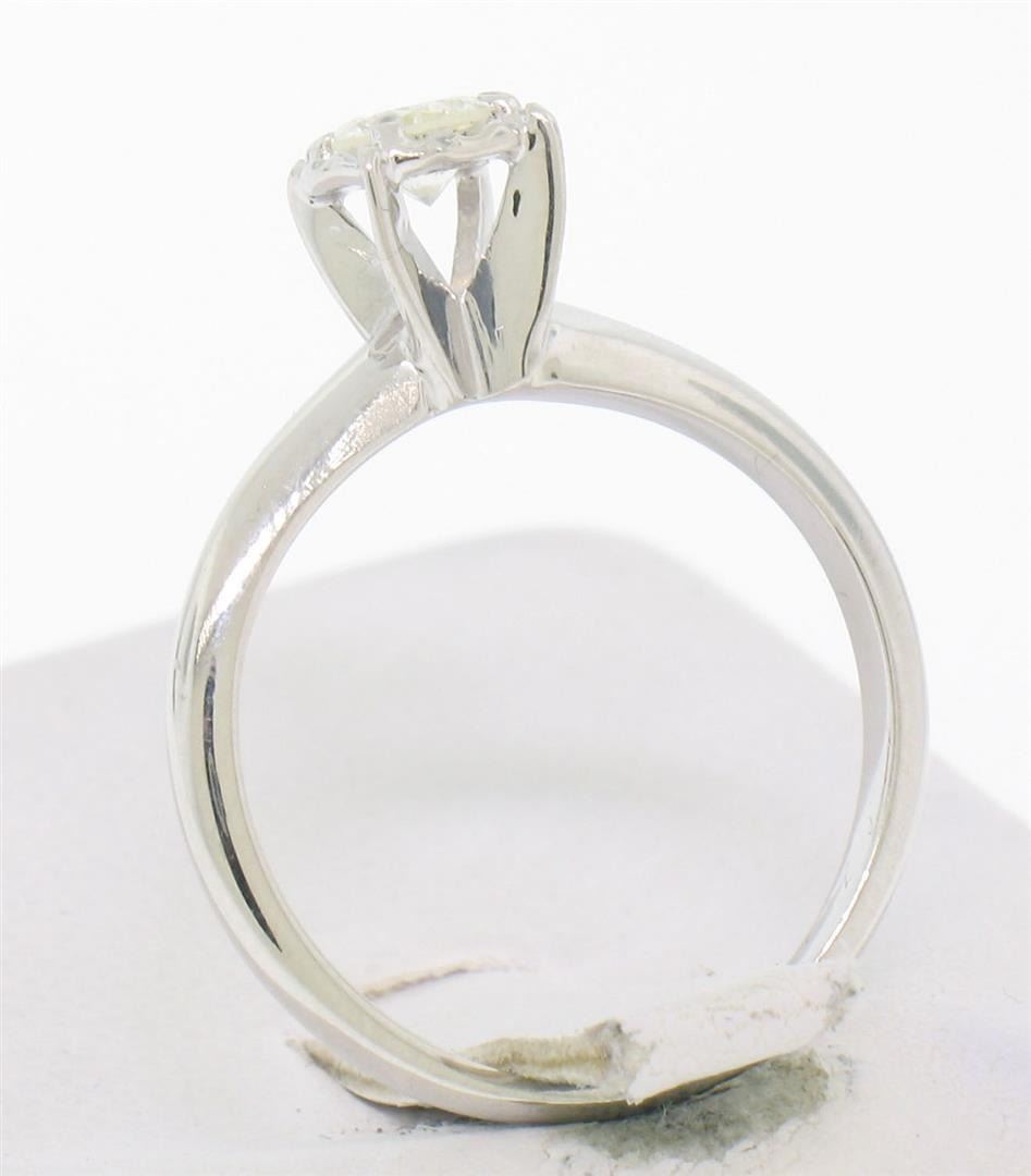 An estate solid 14k white gold solitaire engagement ring, with 1 round brilliant cut natural diamond (H/I- VS1; 0.22ct). The ring is size 5.0, weighs a total of 2.10 grams, and measures 5.50mm wide.