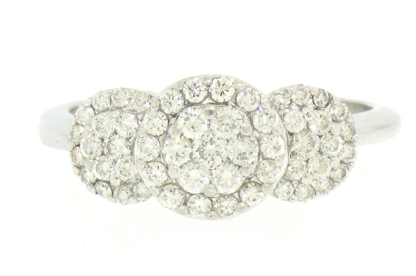 One 14k White Gold F VS2 1.25ctw Triple Cluster Round Brilliant Diamond Band Ring. Item Details: Material: Solid 14k White Gold, Weight: 4.10 Grams, Stone(s): (52) Natural Genuine Diamonds - Round Brilliant Cut White Diamonds - Prong Set - F Color - VS2 Clarity, Total Carat Weight: 1.25 (approx.), Ring Size: 9.0 (We can custom size this ring.), Ring Width: 8.72mm, Condition: Like New