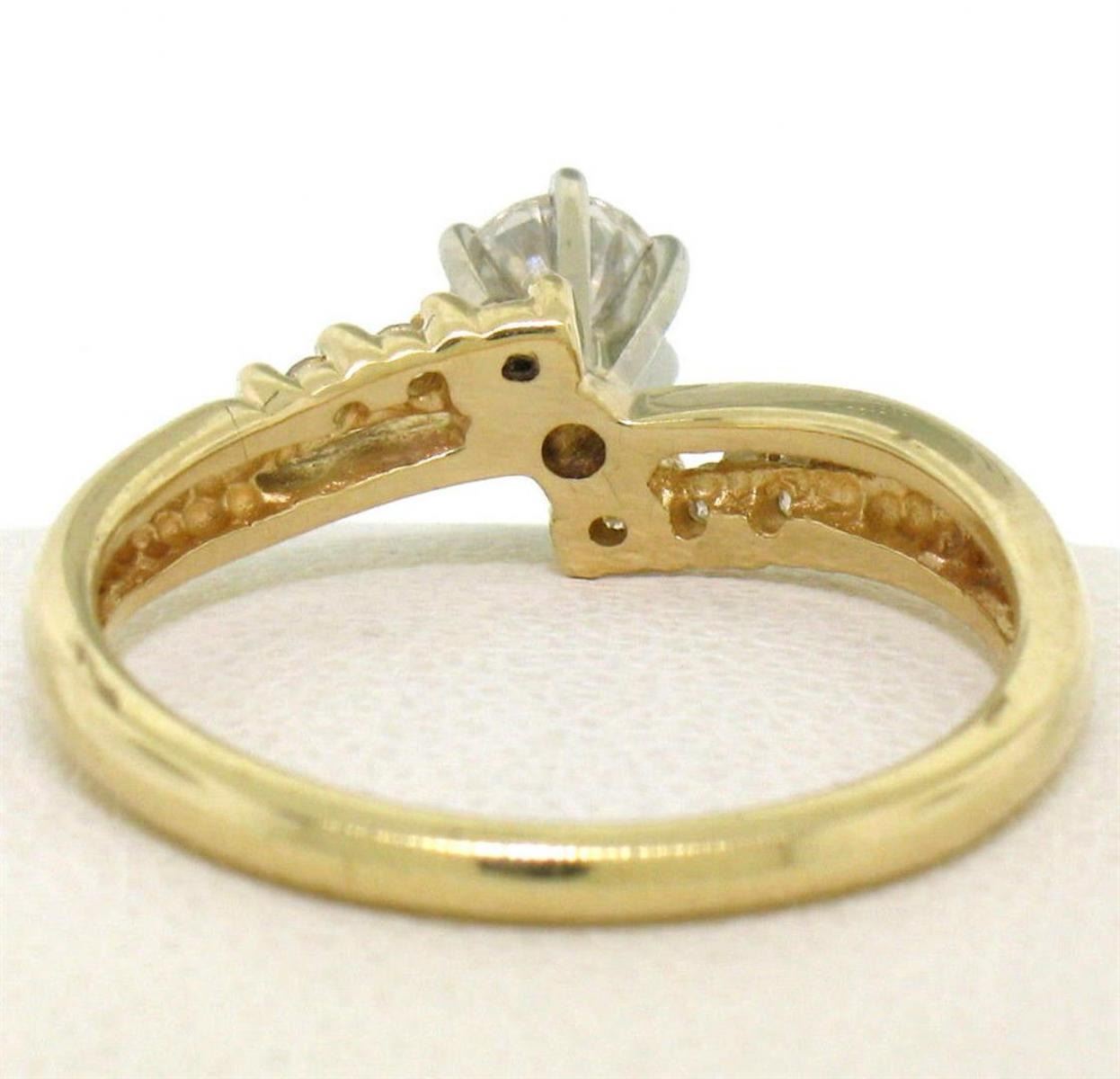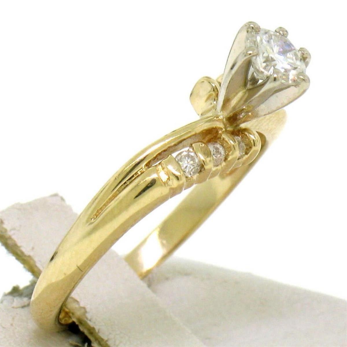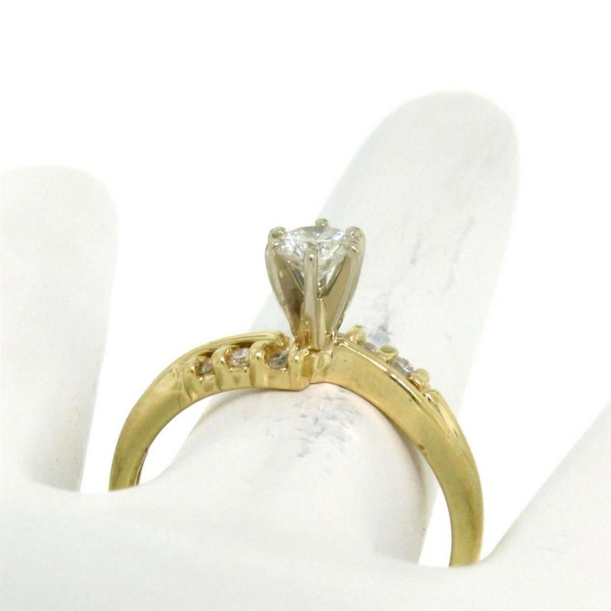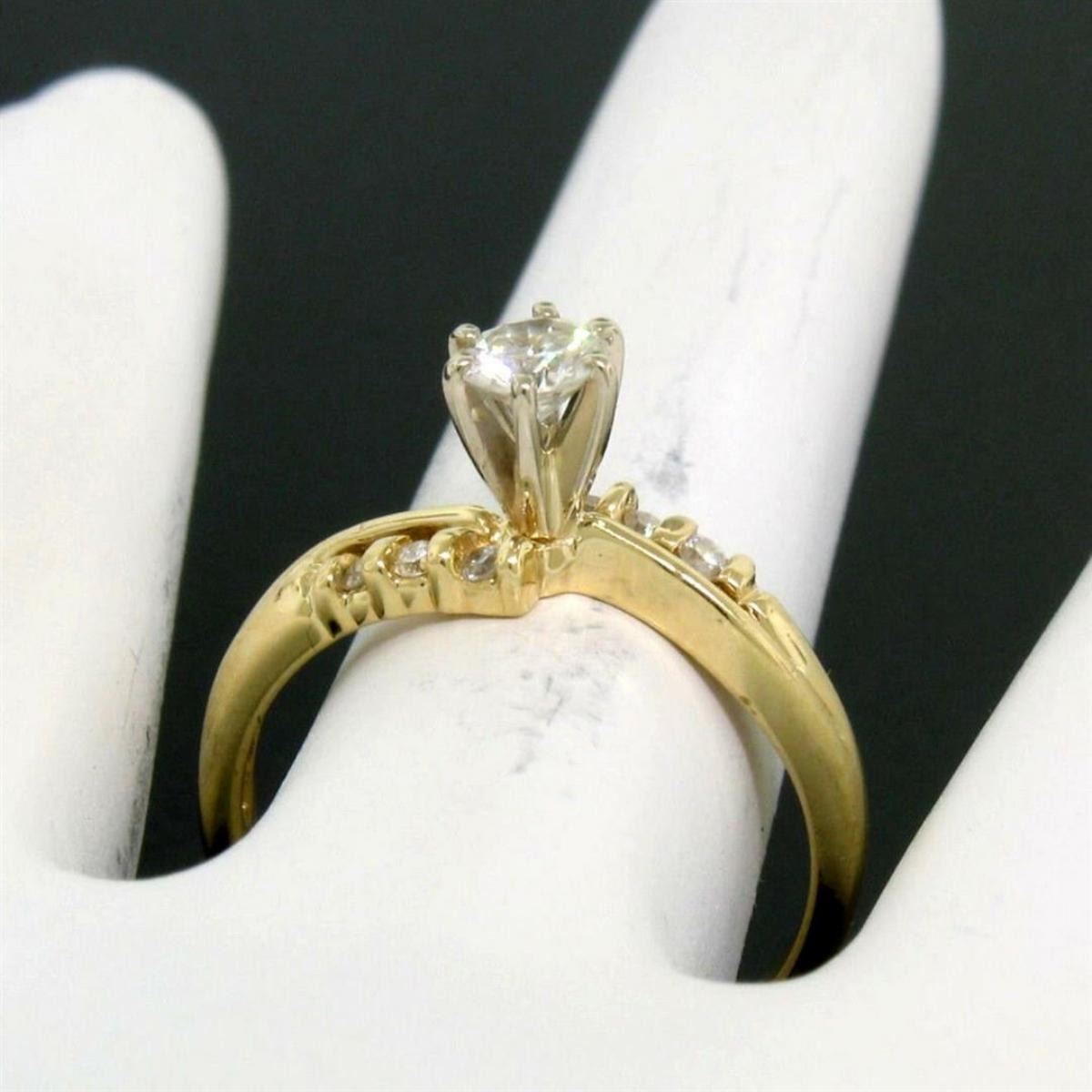 A solid 14k yellow gold engagement ring with a larger round brilliant cut diamond (G/H - SI1; 0.30ct) accented by 6 smaller round brilliant cut diamonds (G/H - SI1; 0.10ctw). The ring is size 6.5, weighs a total of 2.7 grams, and measures 5.8mm wide.