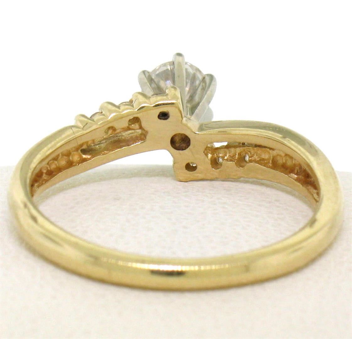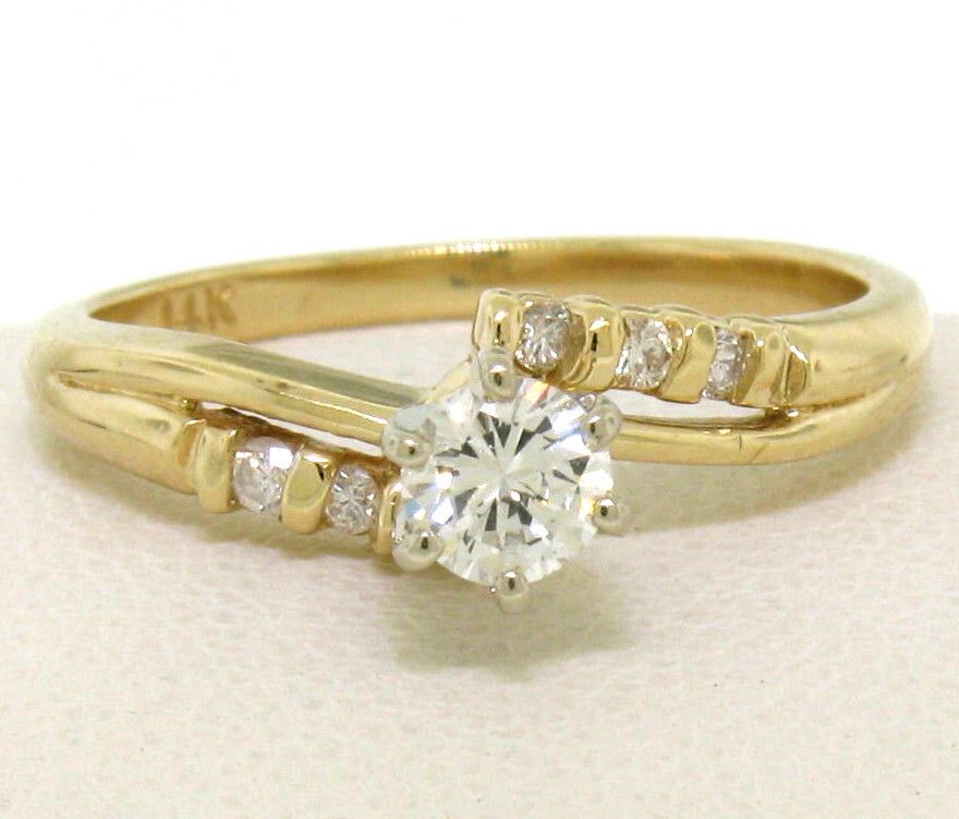 14k Solid Yellow Gold 0.40ctw Round Brilliant Diamond Solitaire Engagement Ring. Please see photos and description for all available information. An estate solid 14k yellow gold solitaire engagement ring, featuring 1 brilliant cut nautural diamond (G/H- SI1; 0.30ct ), accented with 6 round brilliant cut natural diamonds (G/H- SI1; 0.10ctw). The ring is size 6.5, weighs a total of 2.7 grams, and measures 5.8mm wide.
