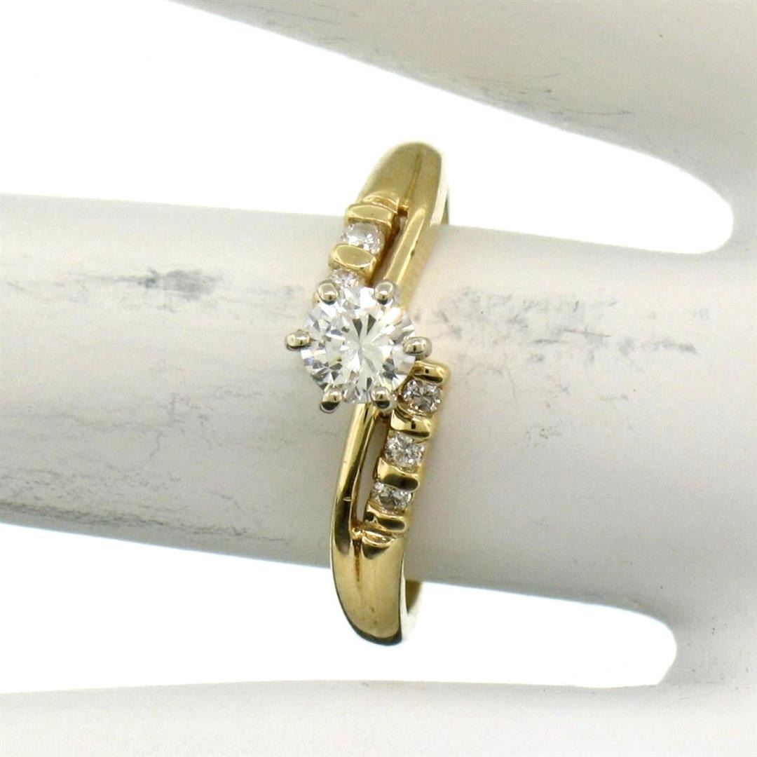 14k Solid Yellow Gold 0.40ctw Round Brilliant Diamond Solitaire Engagement Ring. Please see photos and description for all available information. An estate solid 14k yellow gold solitaire engagement ring, featuring 1 brilliant cut nautural diamond (G/H- SI1; 0.30ct ), accented with 6 round brilliant cut natural diamonds (G/H- SI1; 0.10ctw). The ring is size 6.5, weighs a total of 2.7 grams, and measures 5.8mm wide.