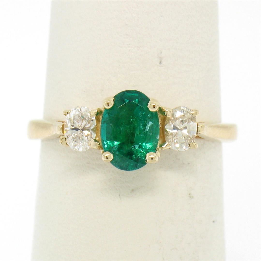 One 14k Solid Yellow Gold 1.03ctw Three Stone Prong Set Oval Emerald & Diamonds Ring. Item Details: Material: 14k Solid Yellow Gold, Weight: 2.30 Grams, Stone(s): (1) Natural Genuine Emerald- Oval Cut - Prong Set - Rich Green Color - Translucent - Very high quality - 0.63ctw, (2) Natural Genuine Diamonds - Oval Cut - Prong Set - VS1-VS2 Clarity - G-H Color- 0.40ctw Approx., Total Carat Weight: 1.03ctw, Ring Size: 6 (We can custom size this ring.), Ring Width: 6.81mm at its widest (Where the emerald is), Ring Height: 5.87mm rise off the finger at its highest point, Condition: Like New!