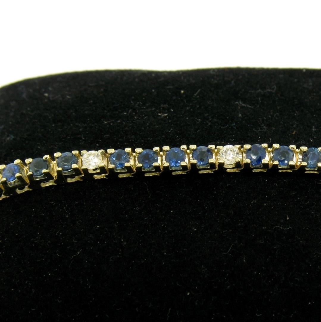 An estate solid 14k yellow gold line tennis bracelet, with 45 round brilliant cut natural sapphires (4.50ctw), and 9 round brilliant cut natural diamonds (G/H - VS1/VS2; 0.63ctw). It weighs a total of 11.8 grams, measures 2.9mm wide, and measures 7.25 inches in length.