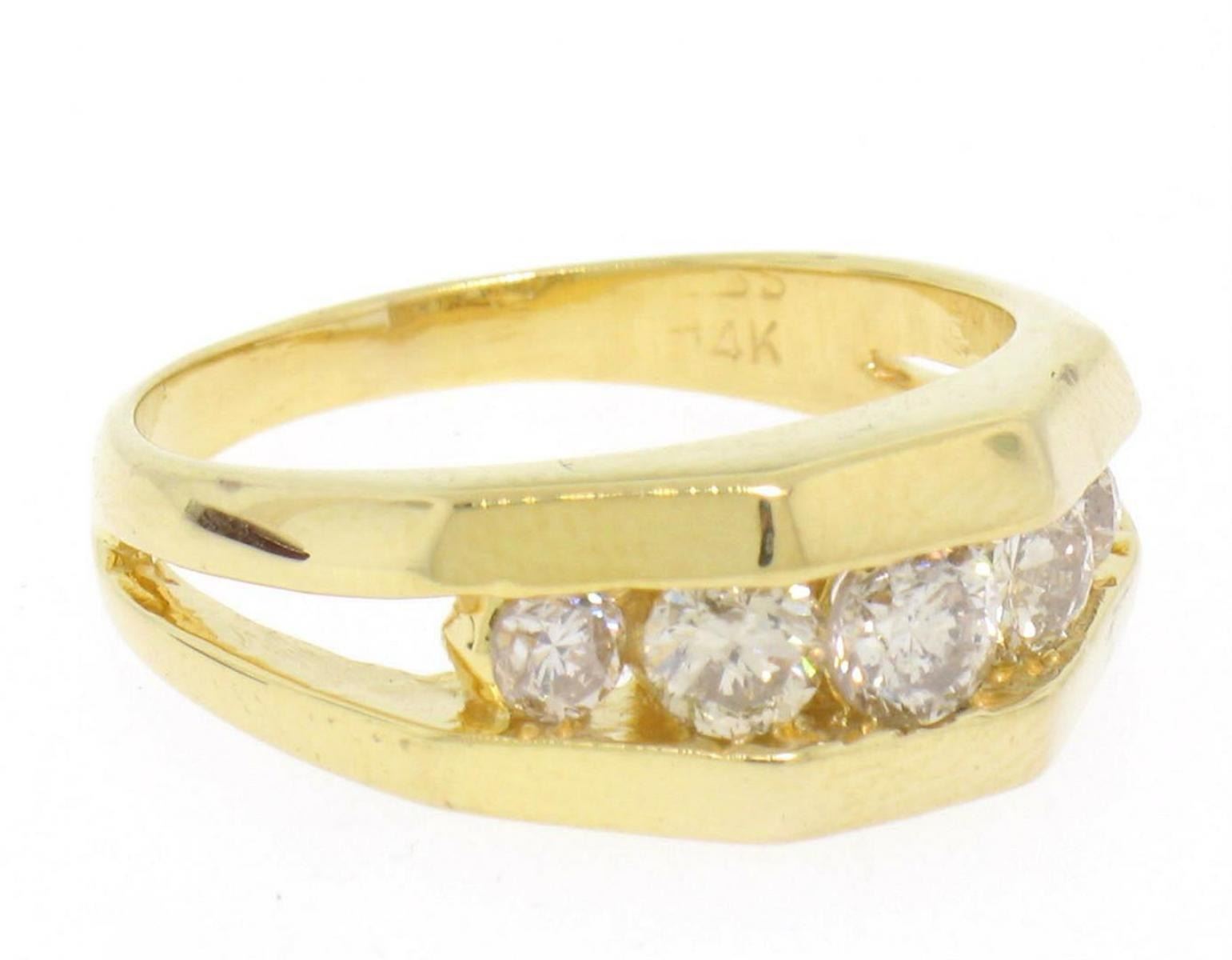 One 14k Yellow Gold 0.60ctw Channel Set Graduated Round Diamond Geometric Band Ring. Item Details: Material: 14K Solid Yellow Gold, Weight: 5.70 Grams , Stone: (5) Natural Genuine Diamonds - Round Brilliant Cut - Channel Set - G/H Color - SI1 Clarity - 0.60ctw (approx.), Size: 7.0 , Width: 7.75mm, Condition: Like New