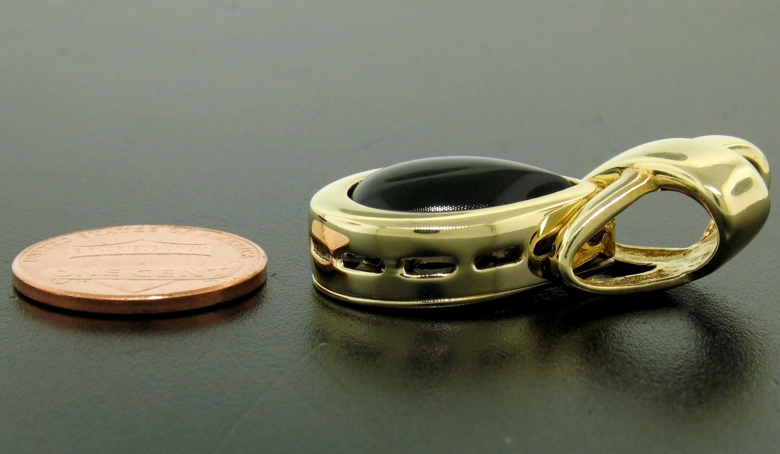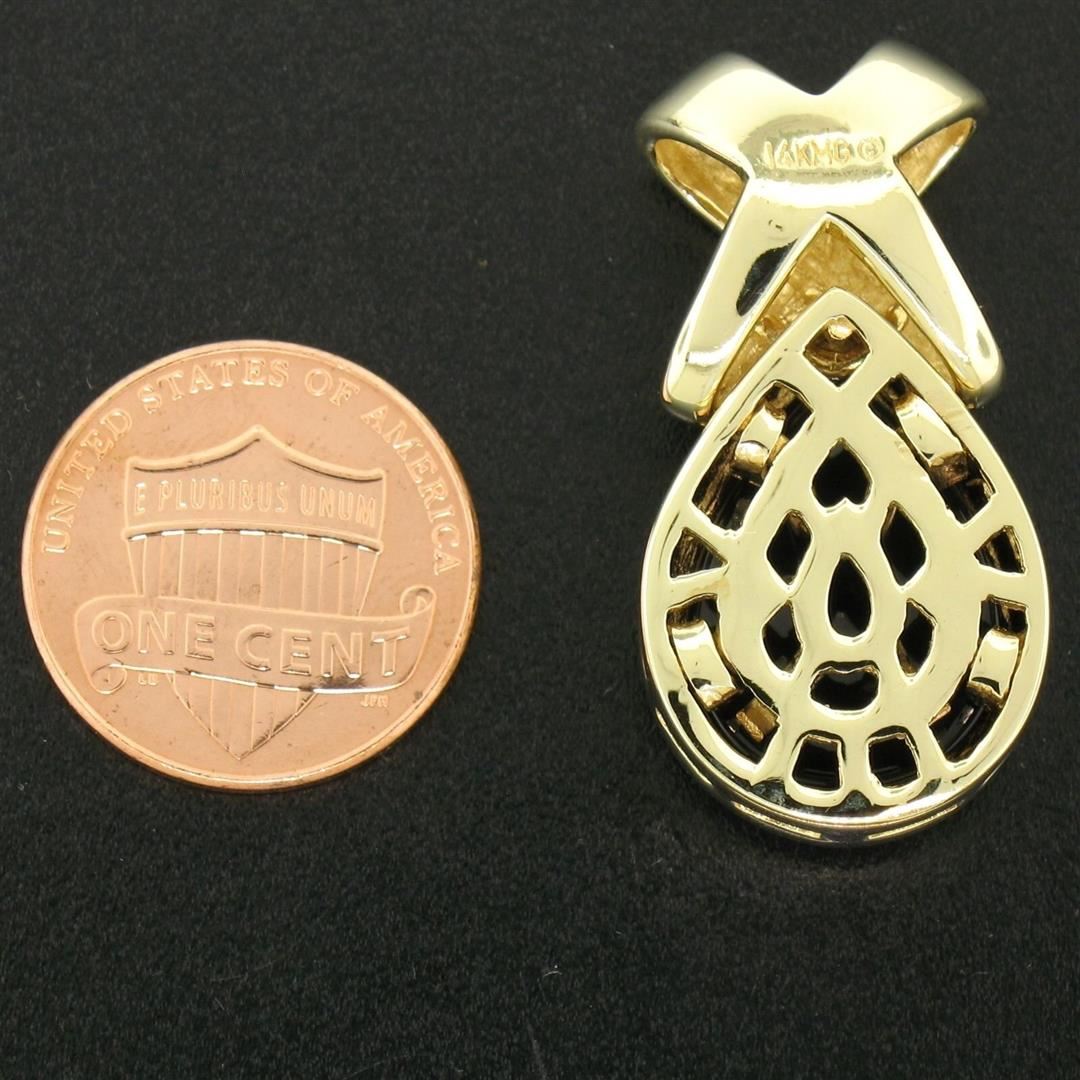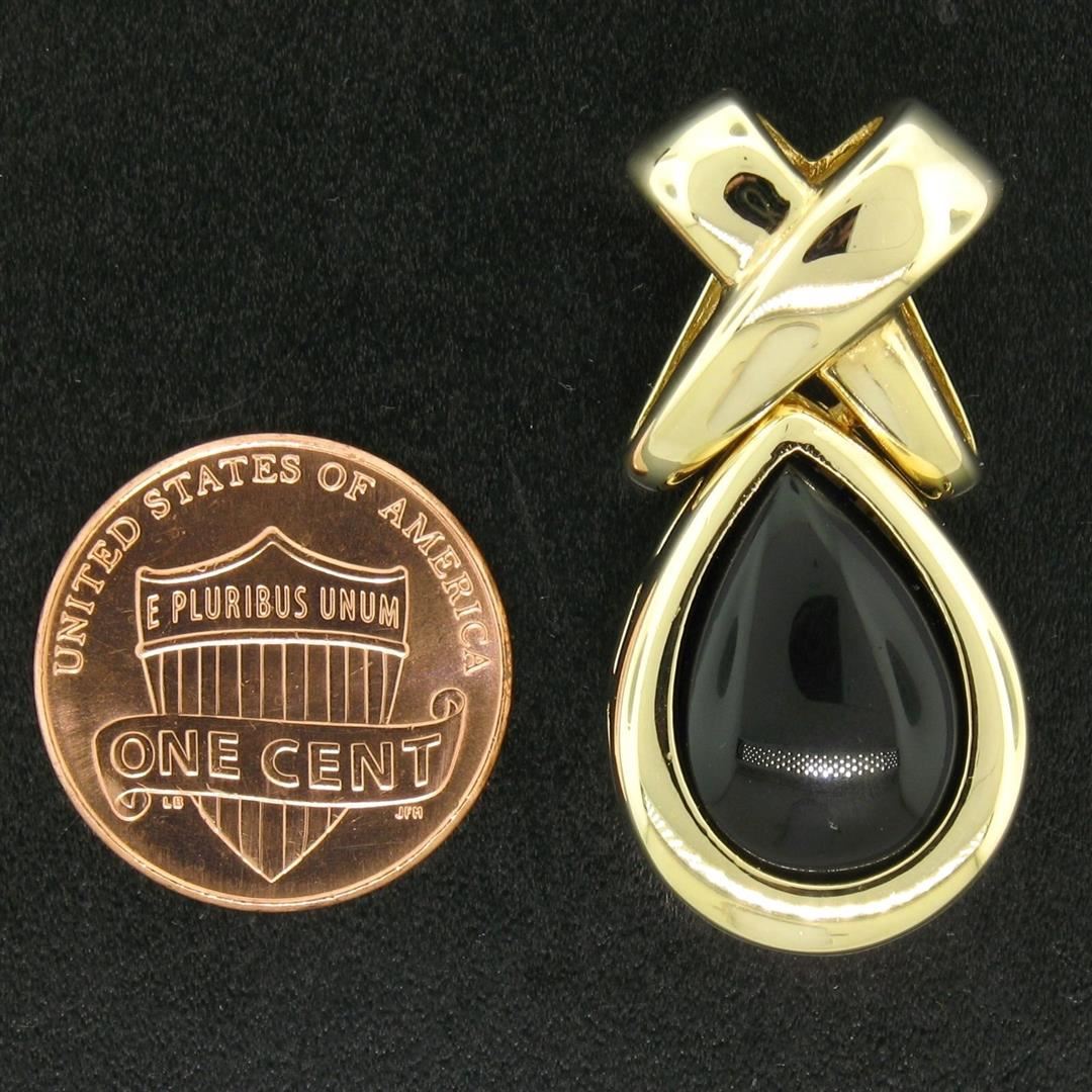 An estate solid 14k yellow gold X pendant, with 1 pear cabochon cut natural black onyx (11.6x17.1mm). The pendant weighs a total of 10.0 grams, measures 34.0x16.7mm including the bail, and the inside of the bail measures 8.40x6.35mm.