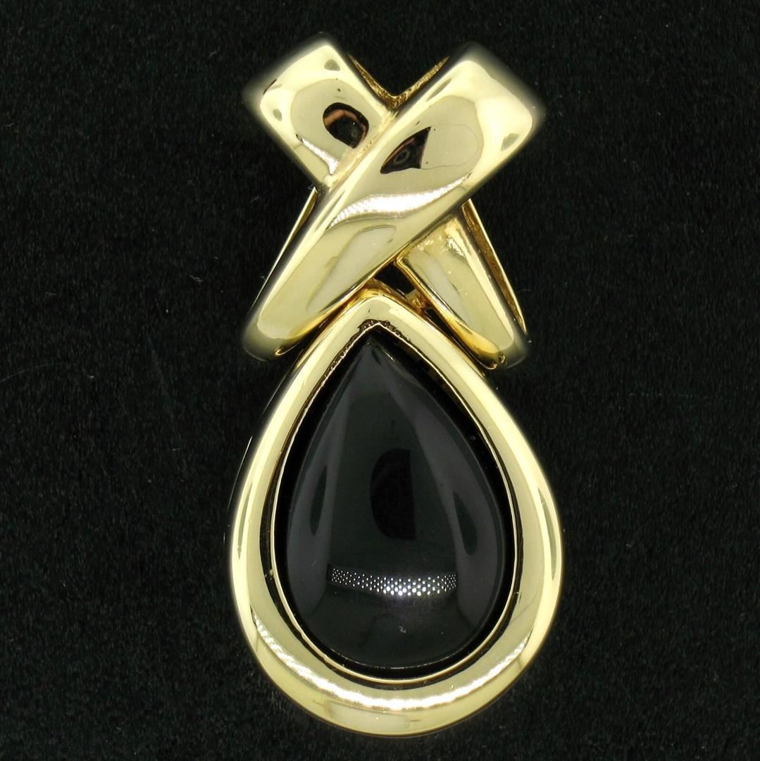 An estate solid 14k yellow gold X pendant, with 1 pear cabochon cut natural black onyx (11.6x17.1mm). The pendant weighs a total of 10.0 grams, measures 34.0x16.7mm including the bail, and the inside of the bail measures 8.40x6.35mm.