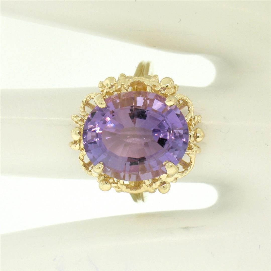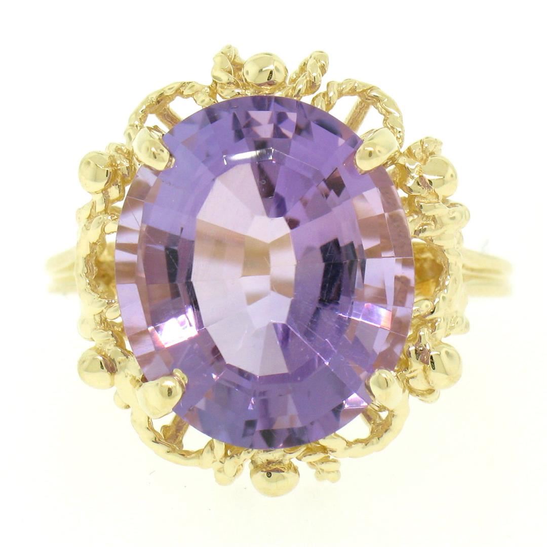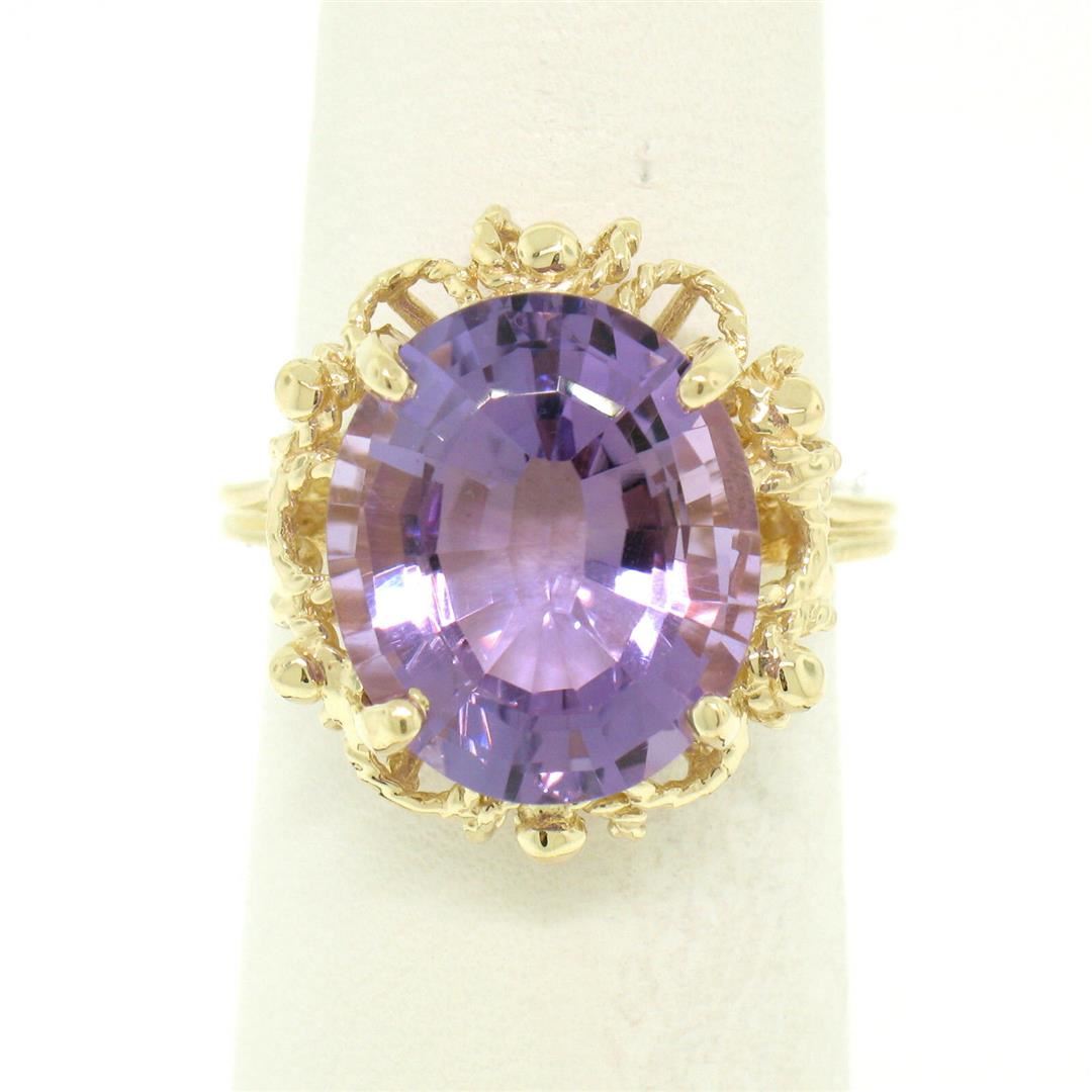 One 14k Solid Yellow Gold Rope Frame Large 6.71ct Oval Step Amethyst Solitaire Ring. Item Details: Material: 14k Solid Yellow Gold, Weight: 6.1 Grams, Stone(s): (1) Natural Genuine Amethyst - Oval Step Cut - Prong Set - Even Medium Purple Color - 14.30x12.08mm (approx.), Total Carat Weight: 6.71 (approx.), Ring Size: 6.5 (We can custom size this ring.), Ring Width: 18.60mm, Ring Height: 8.66mm rise off the finger, Condition: Excellent condition!