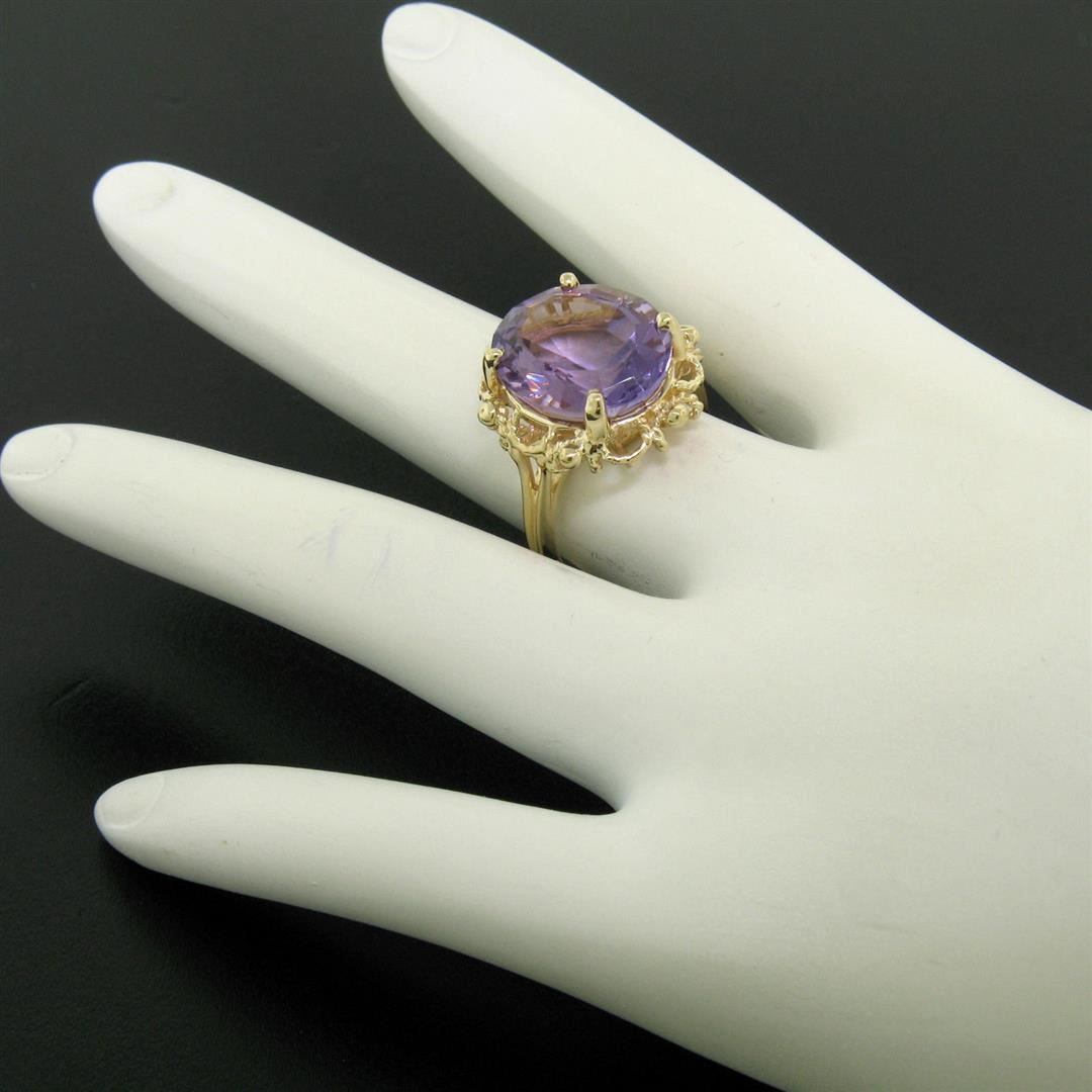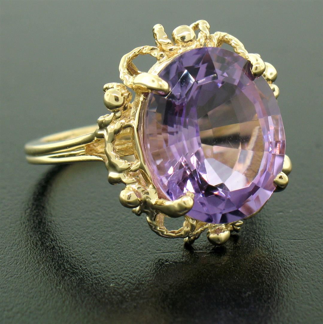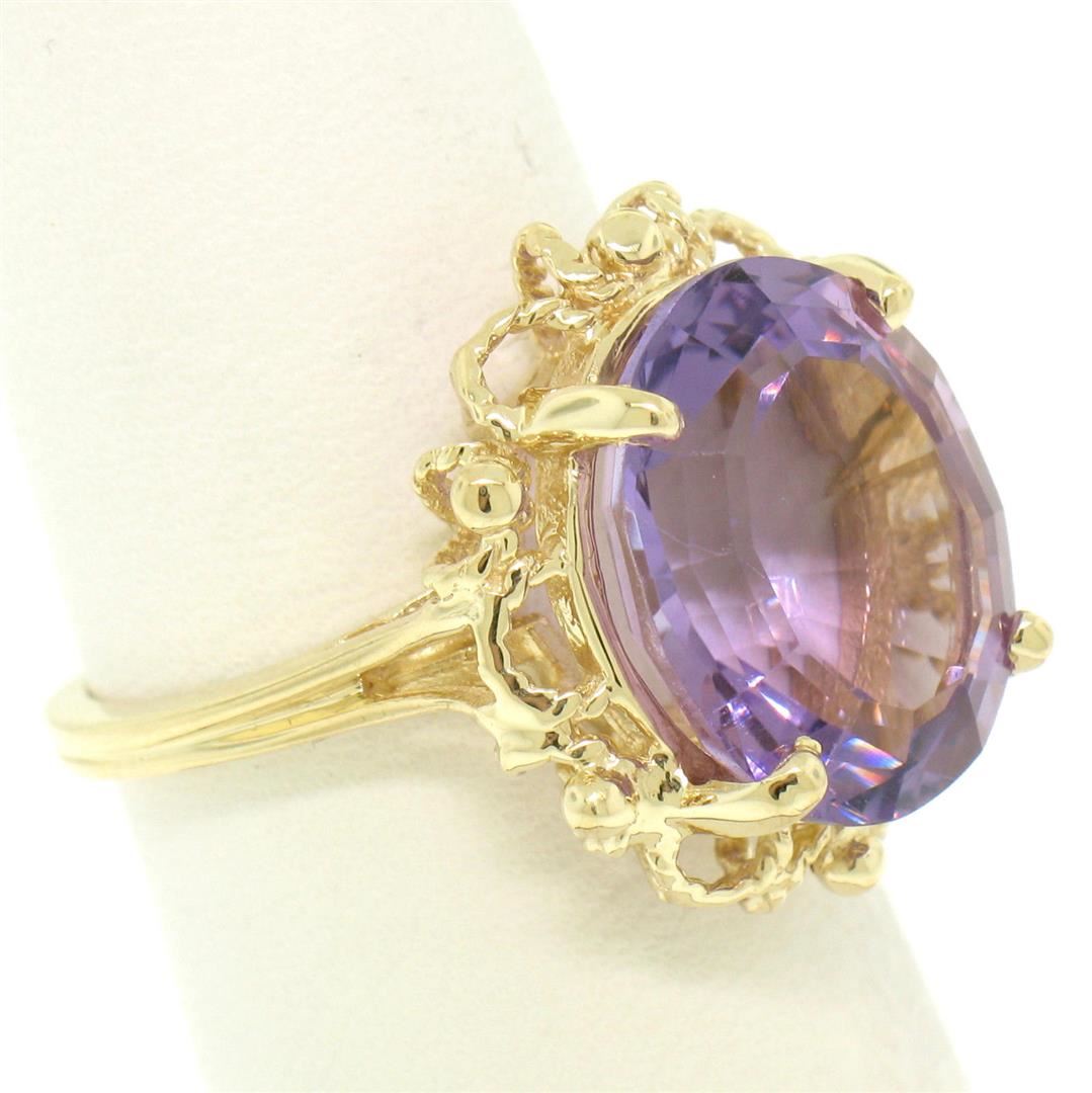 One 14k Solid Yellow Gold Rope Frame Large 6.71ct Oval Step Amethyst Solitaire Ring. Item Details: Material: 14k Solid Yellow Gold, Weight: 6.1 Grams, Stone(s): (1) Natural Genuine Amethyst - Oval Step Cut - Prong Set - Even Medium Purple Color - 14.30x12.08mm (approx.), Total Carat Weight: 6.71 (approx.), Ring Size: 6.5 (We can custom size this ring.), Ring Width: 18.60mm, Ring Height: 8.66mm rise off the finger, Condition: Excellent condition!