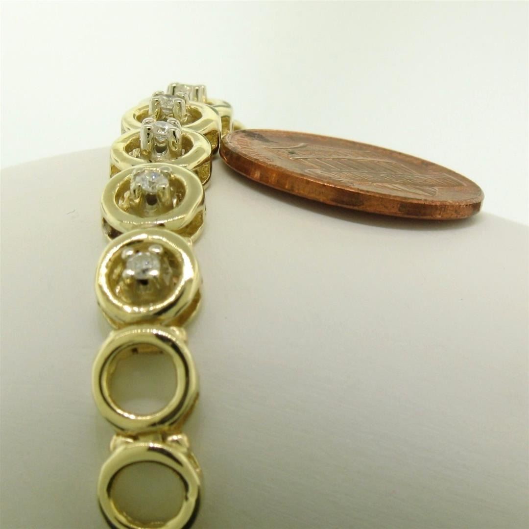 A solid 14k yellow gold bracelet prong set with 6 natural round brilliant cut diamonds (G/H - SI2; 0.20ctw). It weighs a total of 17.1 grams, measures 7.13mm wide, and measures 7 inches in length.