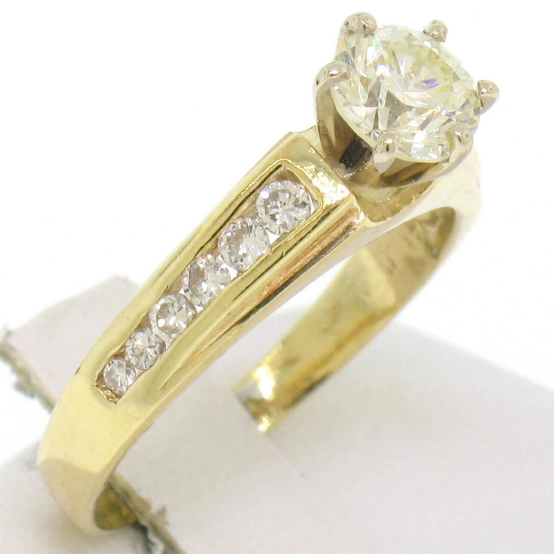 One solid 14k yellow gold engagement ring with a center round brilliant diamond weighing approx. 0.71ct (VS1/L) and 12 round brillaint accent diamonds - 0.25ctw (VS1/G-H). Ring size 6. Weight 2.80 grams.