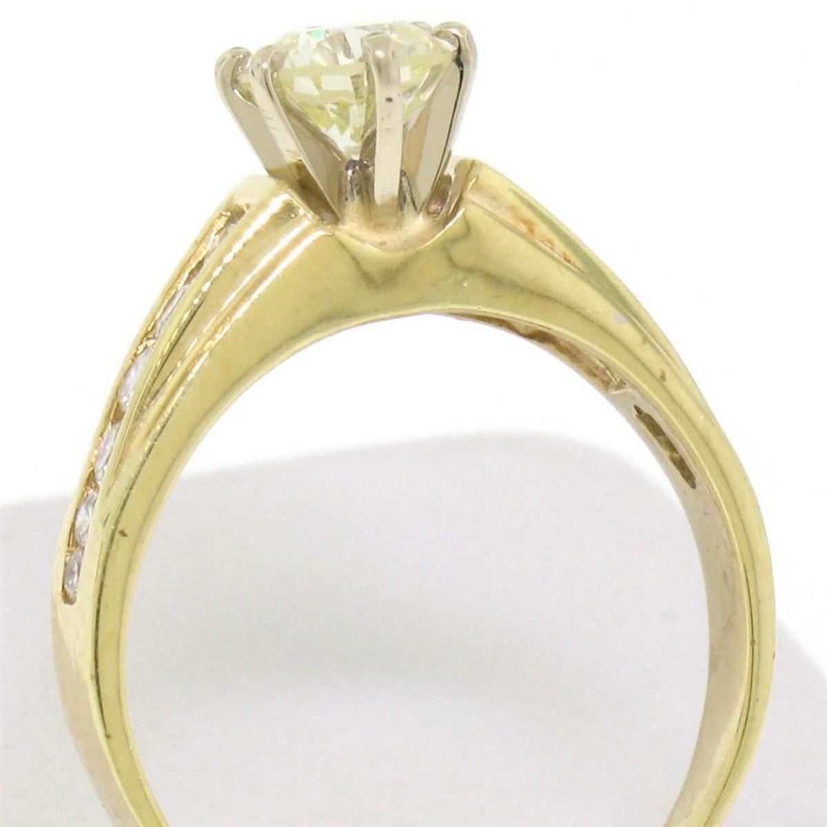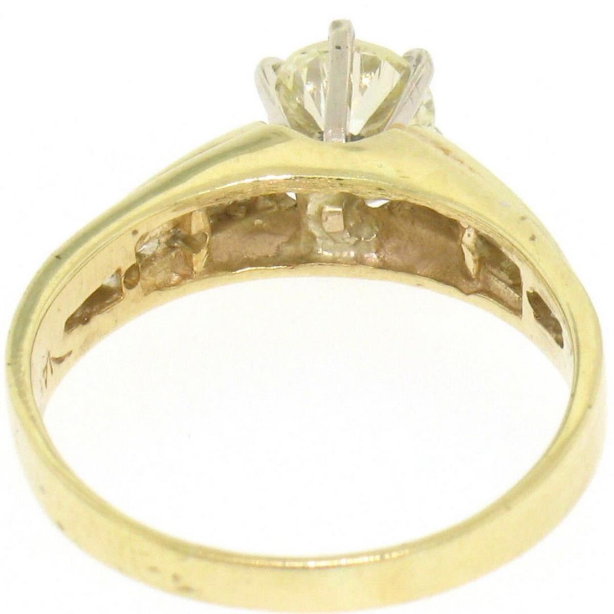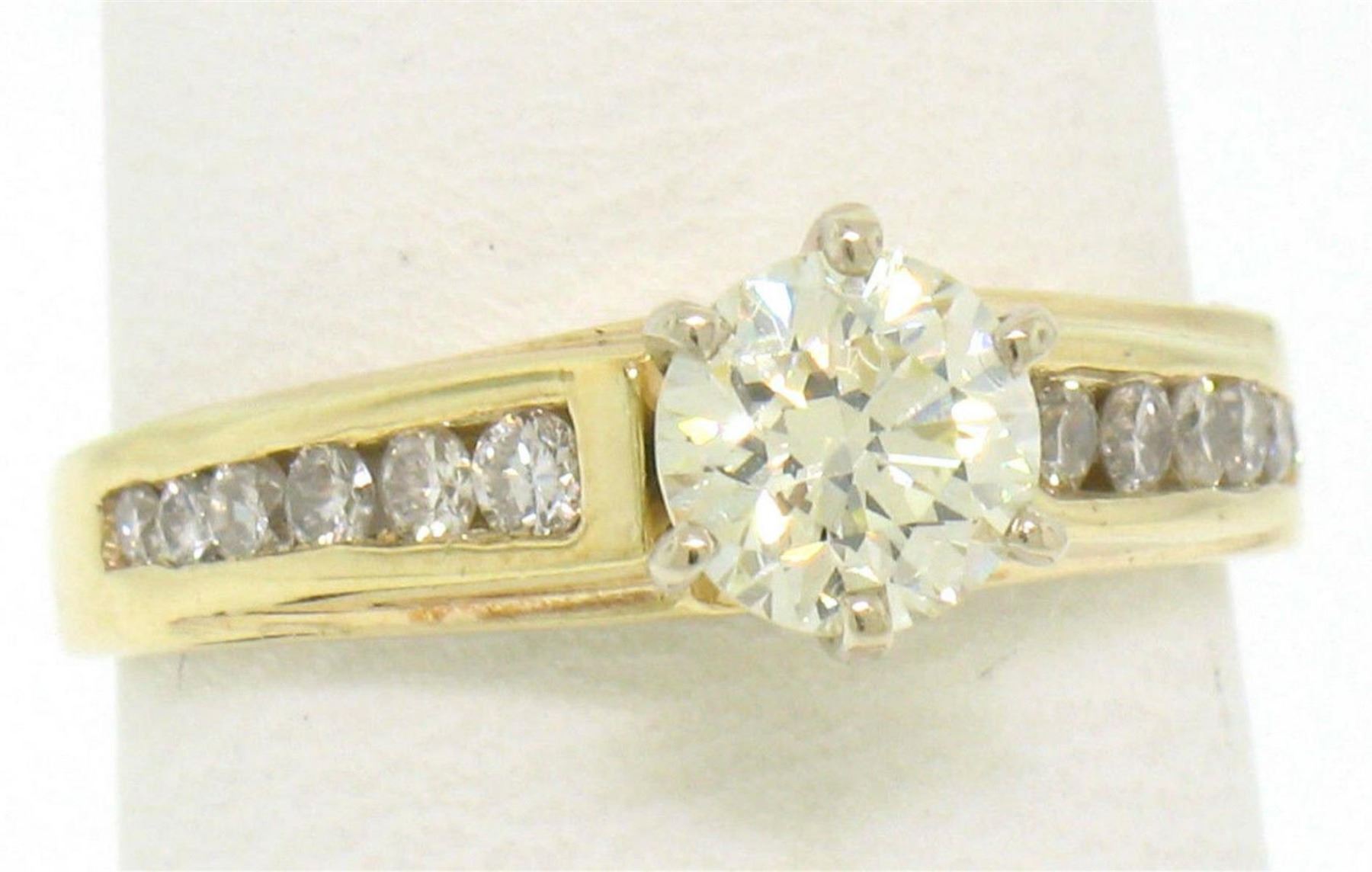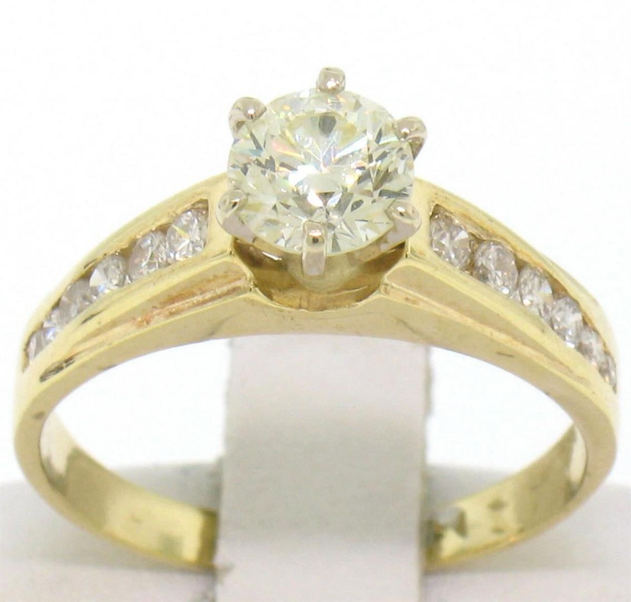 One solid 14k yellow gold engagement ring with a center round brilliant diamond weighing approx. 0.71ct (VS1/L) and 12 round brillaint accent diamonds - 0.25ctw (VS1/G-H). Ring size 6. Weight 2.80 grams.