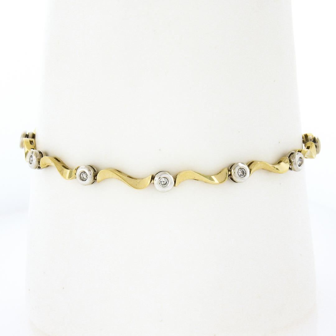 A solid 14k yellow & white gold link bracelet, with 11 round cut natural diamonds (H/I - I1/I2 ; 0.25ctw). It weighs a total of 5.66 grams, measures 4mm wide, and measures 7 inches in length.