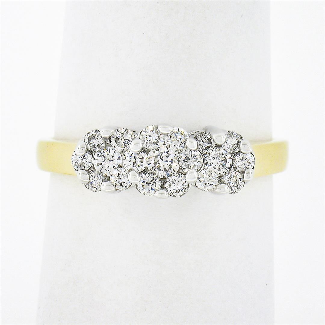 A solid yellow and white gold ring, with 19 roun brilliant cut natural diamonds (G/H - VS2/SI1 ; 0.55ctw). The ring is size 7.0, weighs a total of 3.54 grams, and measures 5.65mm wide.