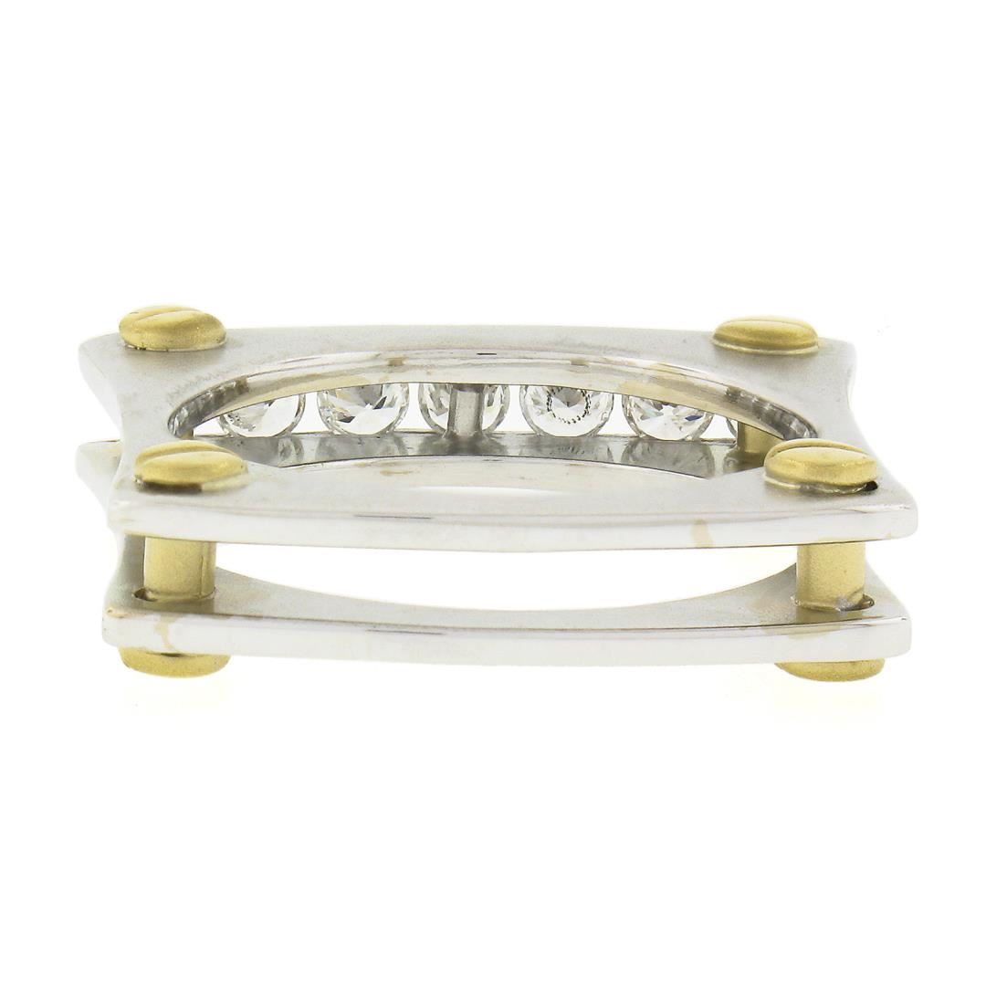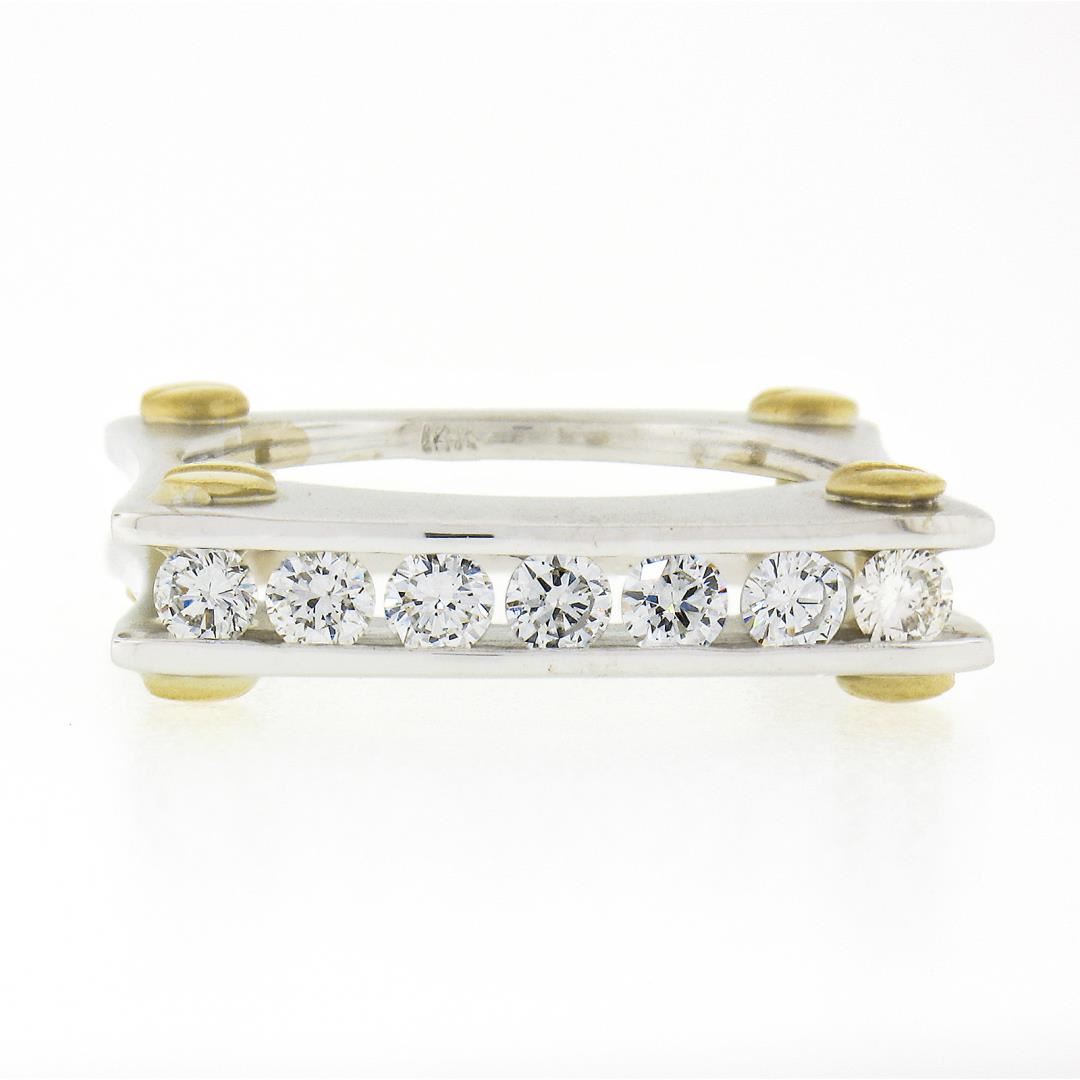 A solid 14k yellow & white gold squared screw double band ring, with 7 round cut natural diamonds (G/H - SI1/SI2 ; 0.60ctw). The ring is size 9.0, weighs a total of 10.68 grams, and measures 4.8mm wide.