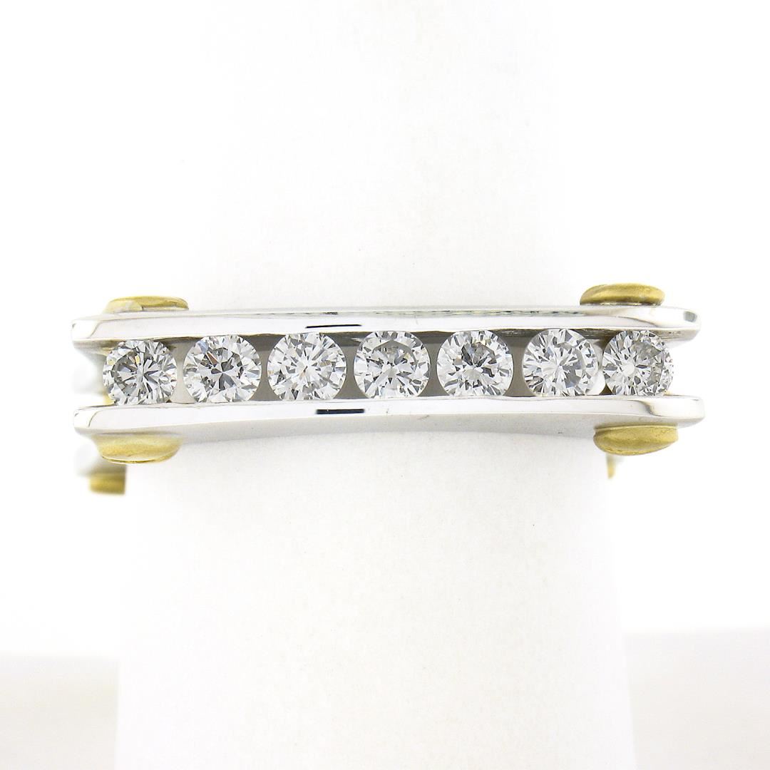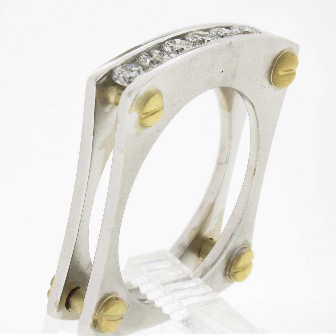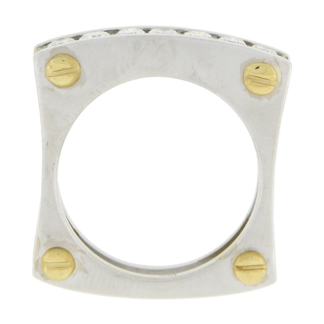 A solid 14k yellow & white gold squared screw double band ring, with 7 round cut natural diamonds (G/H - SI1/SI2 ; 0.60ctw). The ring is size 9.0, weighs a total of 10.68 grams, and measures 4.8mm wide.