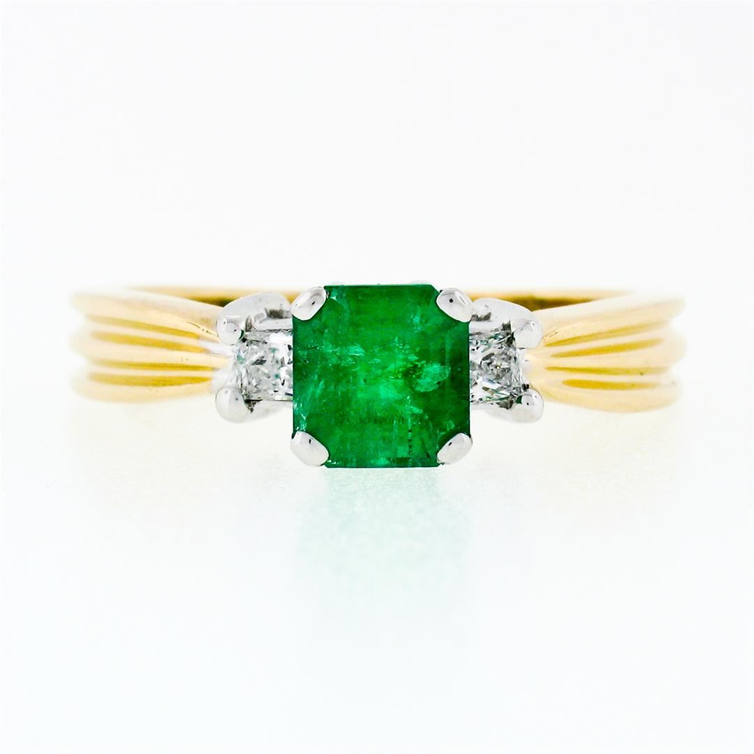 An estate solid 14k yellow & white gold 3 stones ring, with 1 emeradl cut natural emerald (0.88ct), accented with 2 princess cut natural diamonds (G/H - VS1/VS2 ; 0.20ctw). The ring is size 7.5, weighs a total of 4.38 grams, and measures 5.88mm wide.