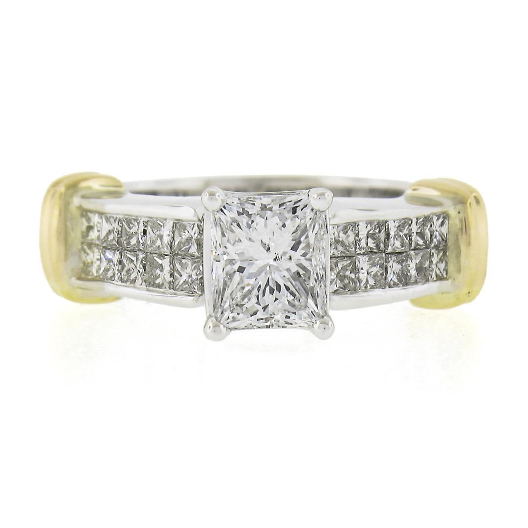 A solid 14k yellow & white gold engagement ring, with 1 GIA graded rectangular cut natural diamond (G - SI2 ; 1.11ct), and 20 princess cut natural diamonds ( J/K - SI1/SI2 ; 0.50ctw). The ring is size 7.0, weighs a total of 5.5 grams, and measures 7.1mm wide. Comes with all original relevant certifications.
