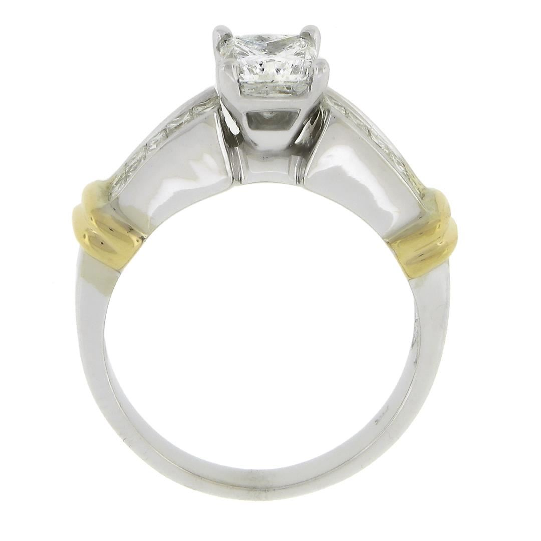 A solid 14k yellow & white gold engagement ring, with 1 GIA graded rectangular cut natural diamond (G - SI2 ; 1.11ct), and 20 princess cut natural diamonds ( J/K - SI1/SI2 ; 0.50ctw). The ring is size 7.0, weighs a total of 5.5 grams, and measures 7.1mm wide. Comes with all original relevant certifications.