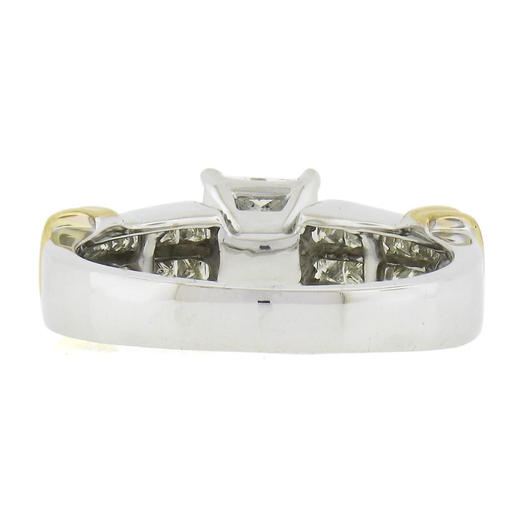 A solid 14k yellow & white gold engagement ring, with 1 GIA graded rectangular cut natural diamond (G - SI2 ; 1.11ct), and 20 princess cut natural diamonds ( J/K - SI1/SI2 ; 0.50ctw). The ring is size 7.0, weighs a total of 5.5 grams, and measures 7.1mm wide. Comes with all original relevant certifications.