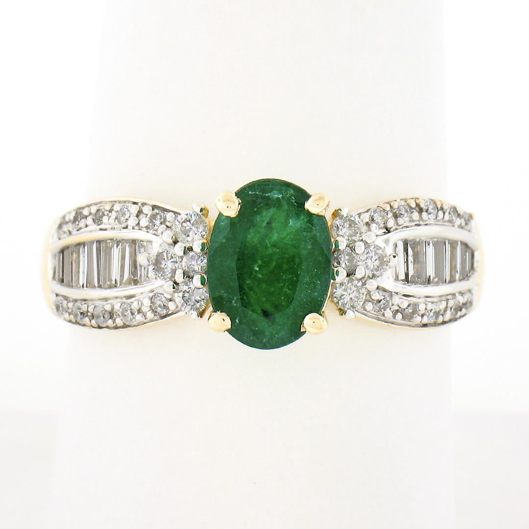 A solid 14k yellow & white gold ring, with 1 oval cut natural emerald (8.06x5.93mm - 1.26ct ), and 28 round brilliant cut natural diamonds (H/I - I1/I2 ; 0.30ctw), and 12 baguette cut natural diamonds (H/I - SI2/I1 ; 0.30ctw). The ring is size 9.0, weighs a total of 3.32 grams, and measures 8.1mm wide.