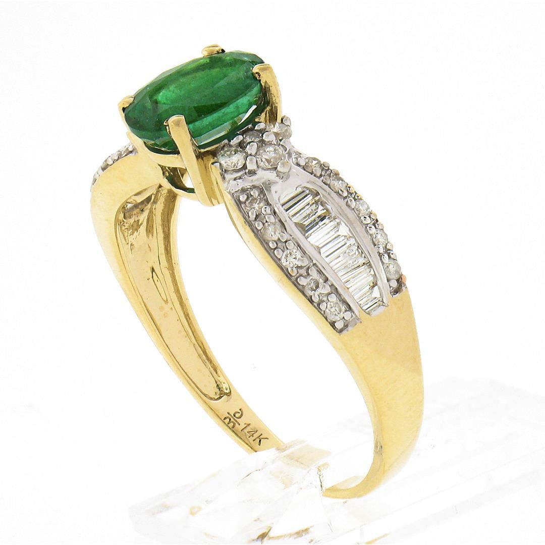 A solid 14k yellow & white gold ring, with 1 oval cut natural emerald (8.06x5.93mm - 1.26ct ), and 28 round brilliant cut natural diamonds (H/I - I1/I2 ; 0.30ctw), and 12 baguette cut natural diamonds (H/I - SI2/I1 ; 0.30ctw). The ring is size 9.0, weighs a total of 3.32 grams, and measures 8.1mm wide.