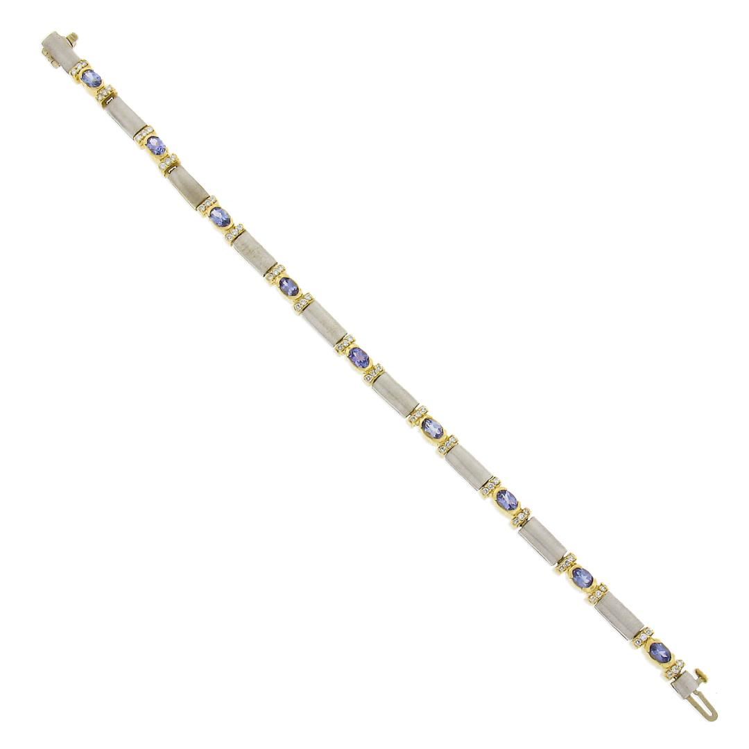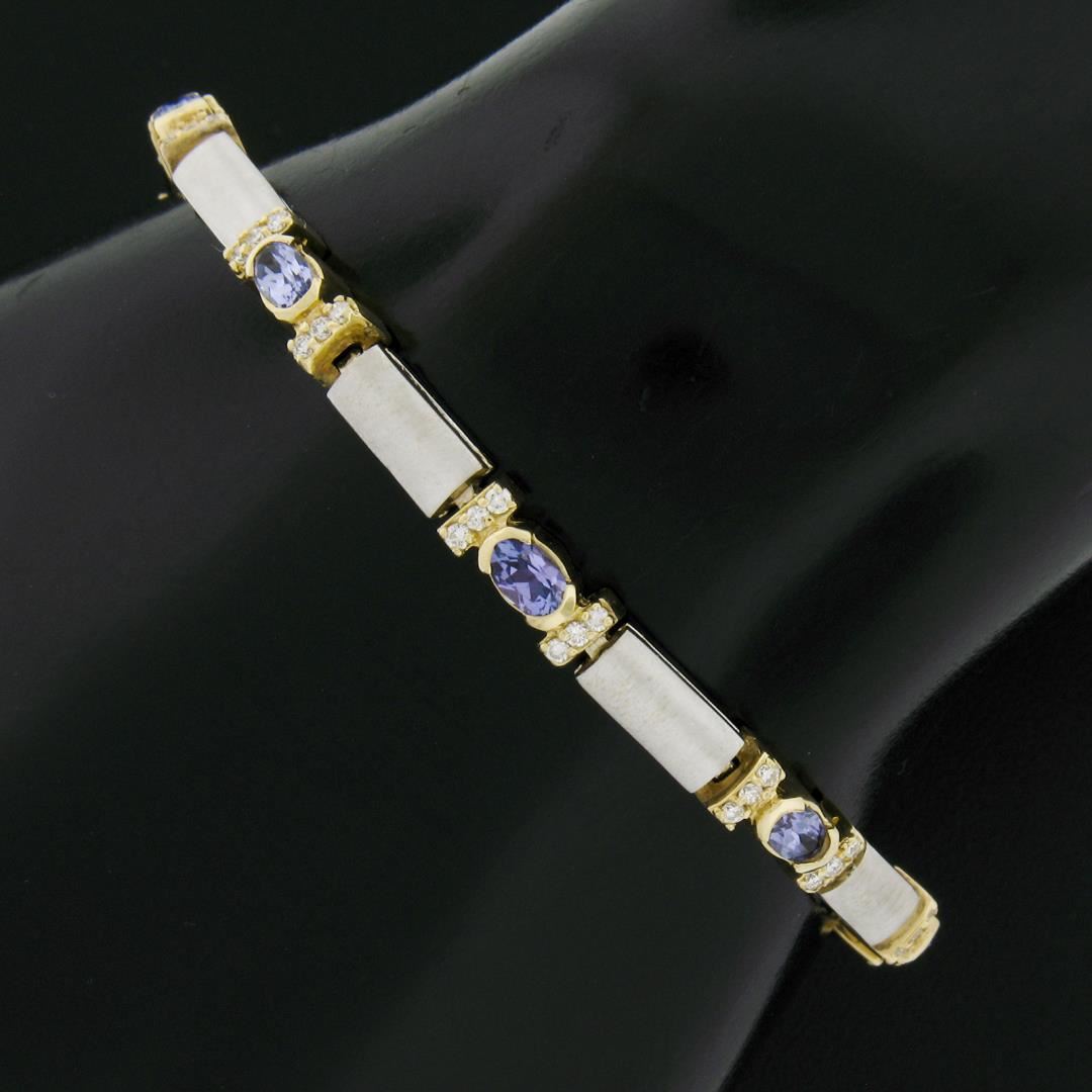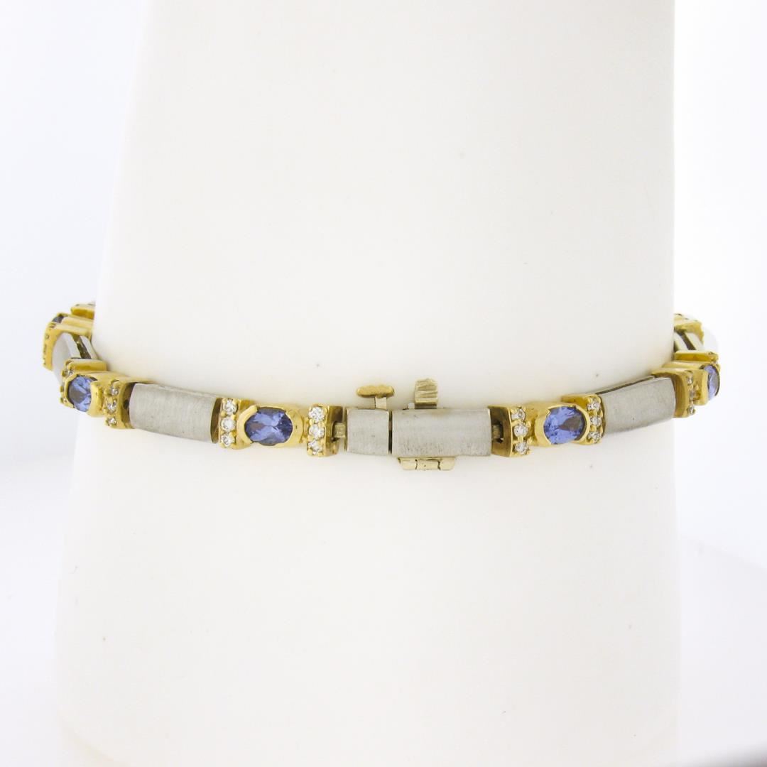 A solid 14k yellow & white gold tennis bracelet, with 54 round cut natural diamonds (G/H  - VS2/SI1 ; 0.62ctw), and 9 oval cut natural tanzanites (1.40ctw). It weighs a total of 16.37 grams, measures 4.5mm wide, and measures 6.75 inches in length.