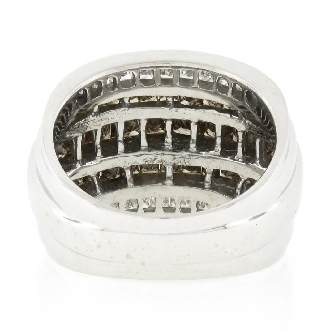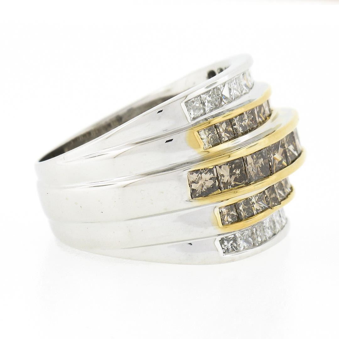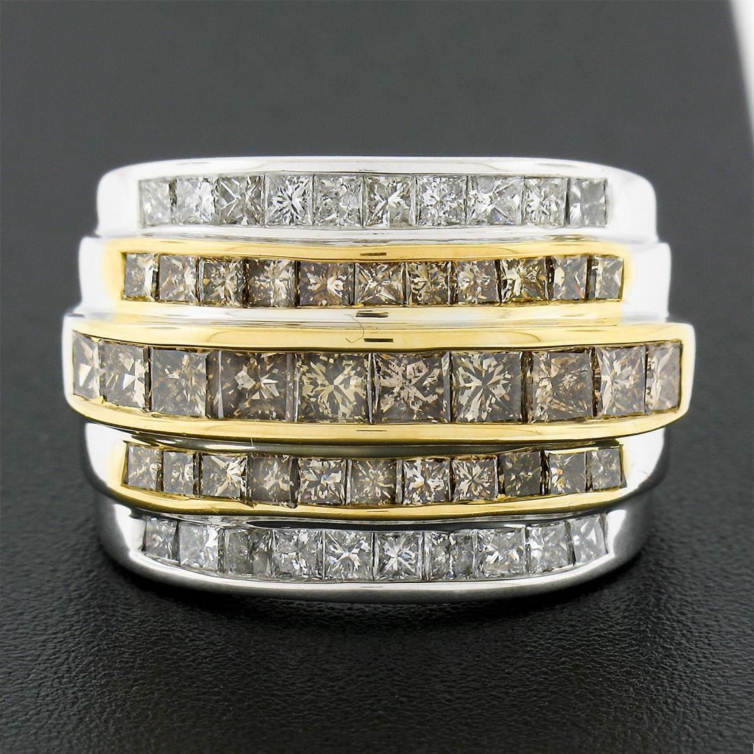 A solid 14k yellow & white gold wide ring, with 20 princess cut natural diamonds (G/H  - SI2/I2 ; 1.0ctw), 32 princess cut natural fancy brown diamonds (SI2/I2 ; 2.90ctw). The ring is size 7.0, weighs a total of 10.37 grams, and measures 15.45mm wide.