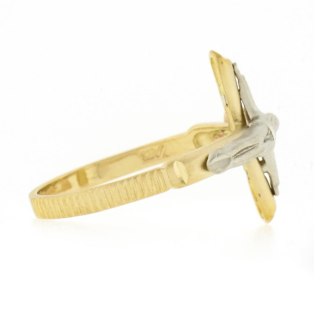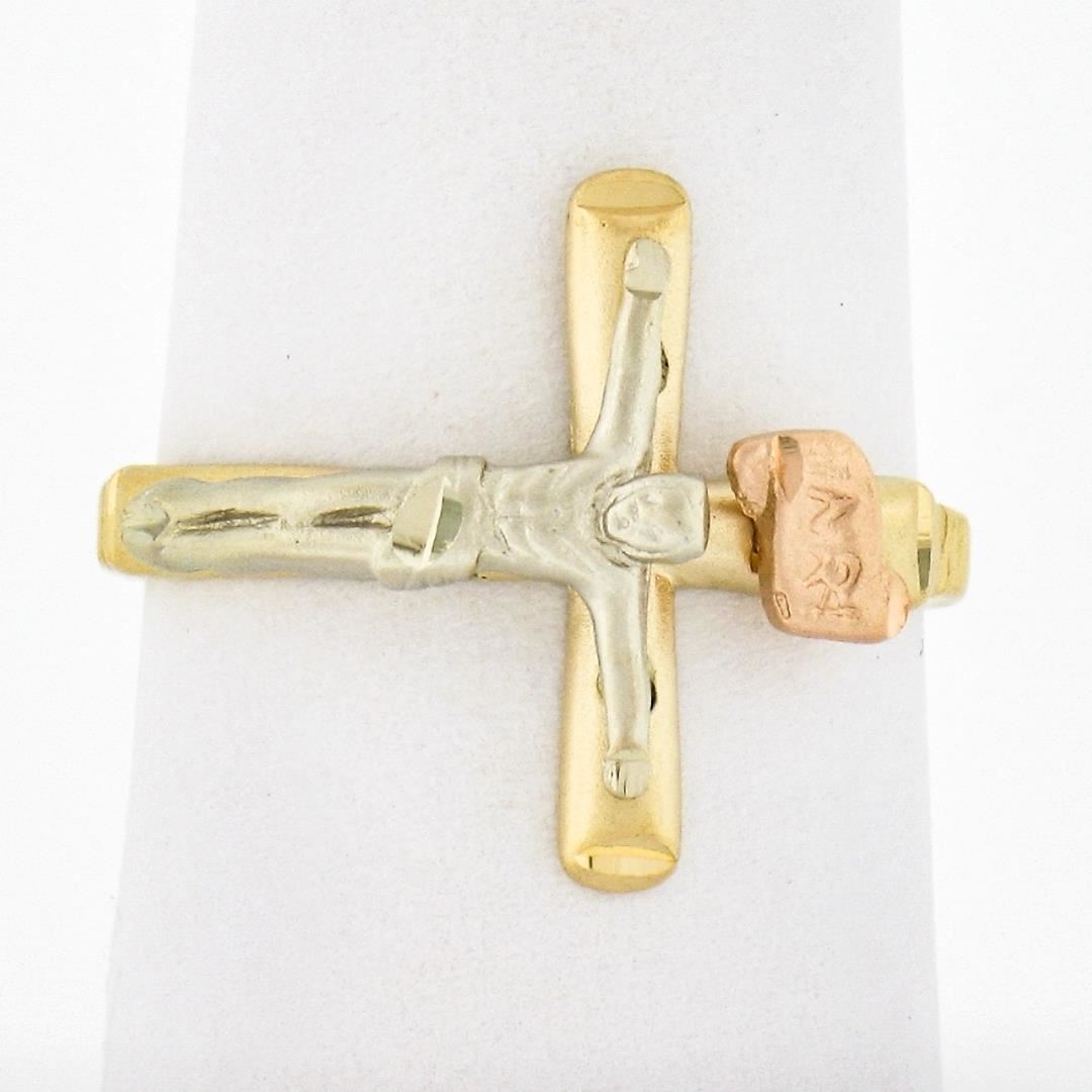14k Tri Color Gold Detailed Matte Finish Coin Edge Crucifix Cross Band Ring