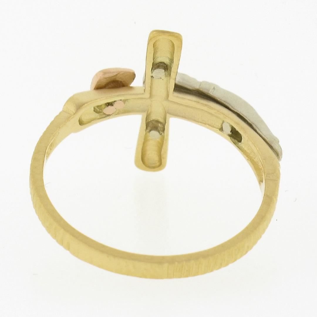 A solid 14k rose, yellow & white Gold Cross ring. The ring is size 5.5, weighs a total of 2.26 grams, and measures 14.75mm wide.