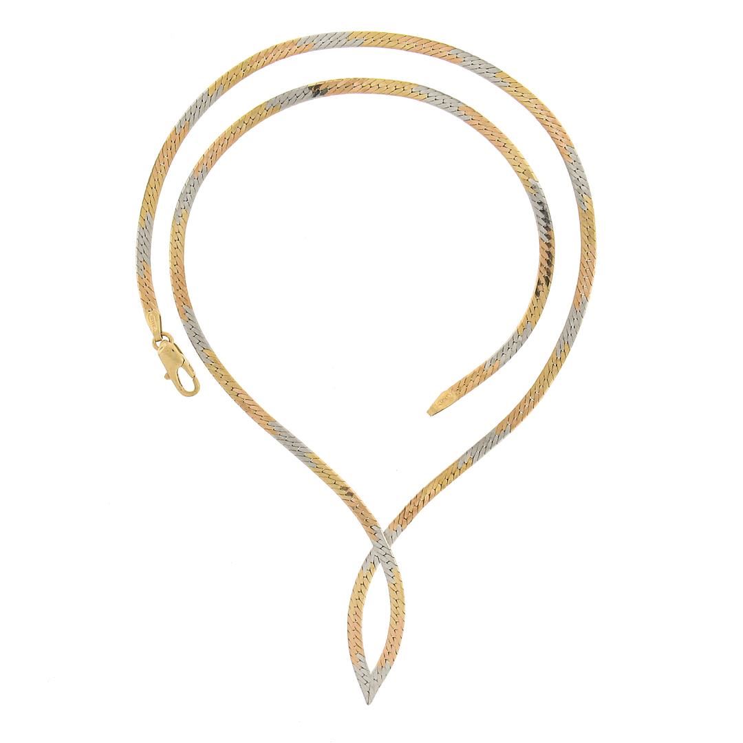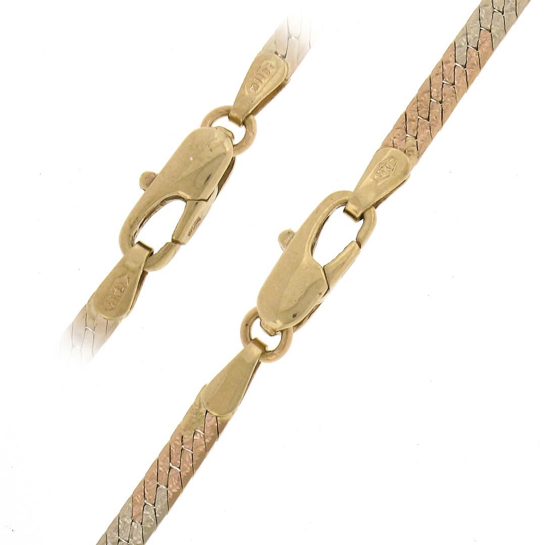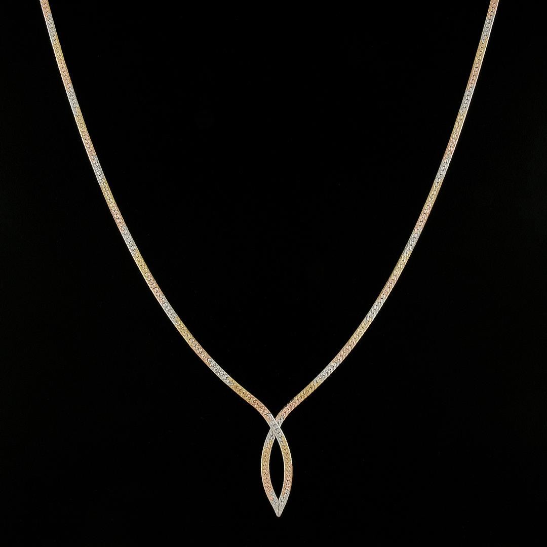 A solid 14k yellow, rose & white gold chevron chain necklace. 17 inch snake link chain, 9.43 grams total weight, center piece measures 29.1x10.3mm.
