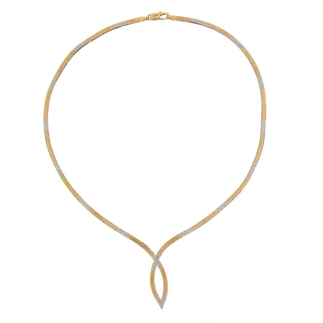 A solid 14k yellow, rose & white gold chevron chain necklace. 17 inch snake link chain, 9.43 grams total weight, center piece measures 29.1x10.3mm.