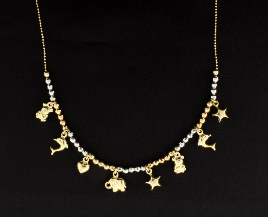 14k tutone animal charm with 5 animals and heart/stars. 16 inches long. Has a 14k lobster claw catch. The chain is diamond cut. 7.6gr