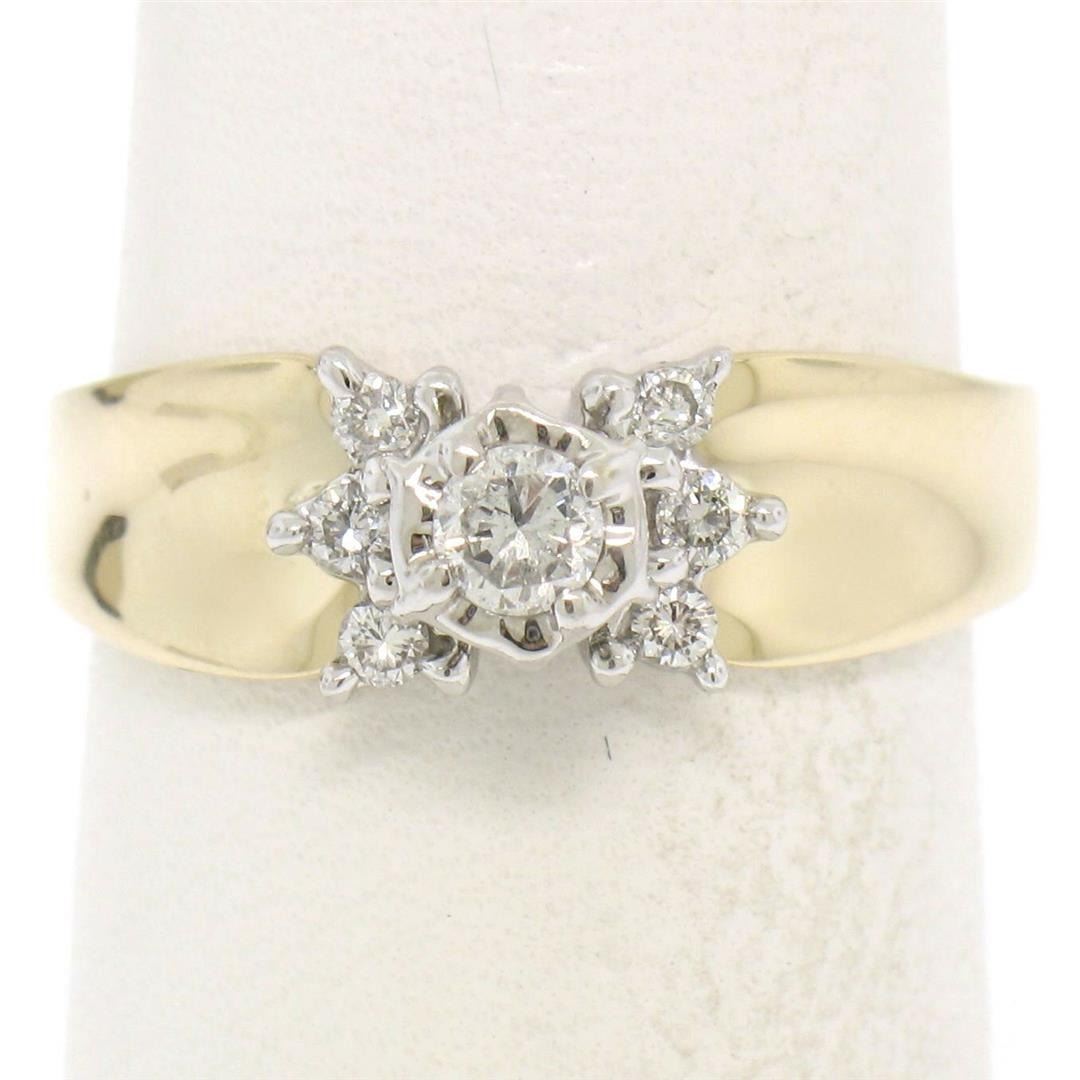 One 14k Two Tone Gold 0.30ctw Illusion Set Solitaire Diamond Engagement Ring Size 7. Item Details: Material: 14K Solid Yellow & White Gold, Weight: 4.3 Grams, Stone(s): (1) Natural Genuine Diamond - Round Brilliant Cut - Illusion Prong Set - G Color - SI1 Clarity - 0.20ct (approx.), (6) Natural Genuine Diamonds - Round Brilliant Cut - Prong Set - H Color - SI2 Clarity - 0.10ctw (approx.), Total Carat Weight: 0.30 (approx.), Ring Size: 7.0, Ring Width: 6.52mm, Ring Height: 7.05mm rise off the finger, Condition: Like New!