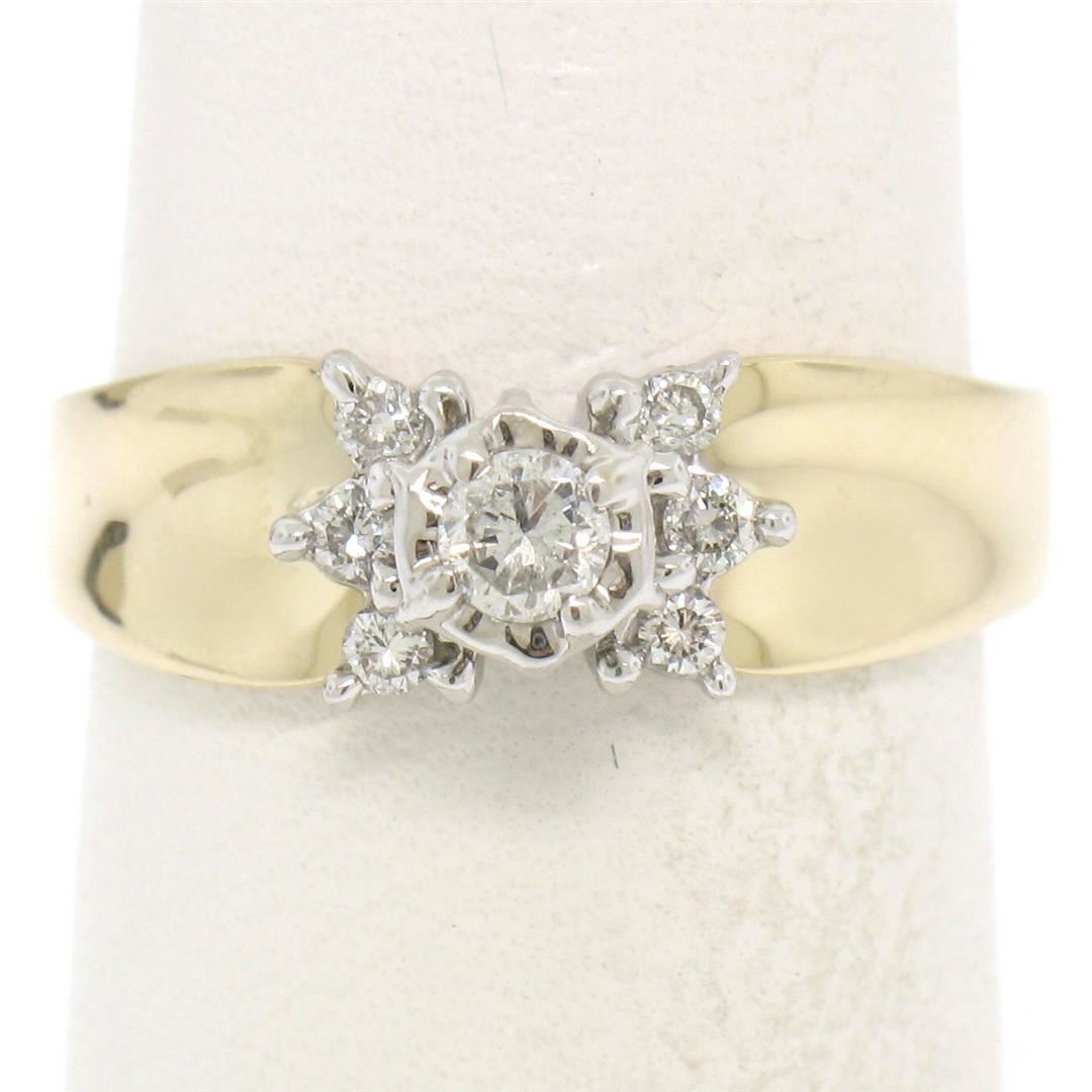 One 14k Two Tone Gold 0.30ctw Illusion Set Solitaire Diamond Engagement Ring Size 7. Item Details: Material: 14K Solid Yellow & White Gold, Weight: 4.3 Grams, Stone(s): (1) Natural Genuine Diamond - Round Brilliant Cut - Illusion Prong Set - G Color - SI1 Clarity - 0.20ct (approx.), (6) Natural Genuine Diamonds - Round Brilliant Cut - Prong Set - H Color - SI2 Clarity - 0.10ctw (approx.), Total Carat Weight: 0.30 (approx.), Ring Size: 7.0, Ring Width: 6.52mm, Ring Height: 7.05mm rise off the finger, Condition: Like New!