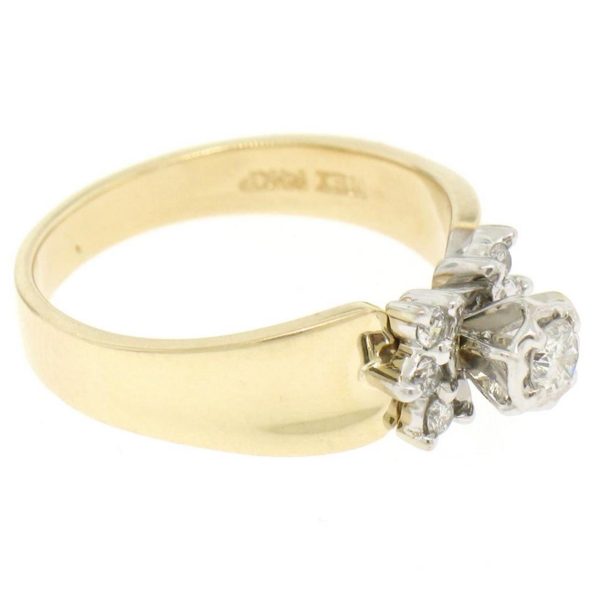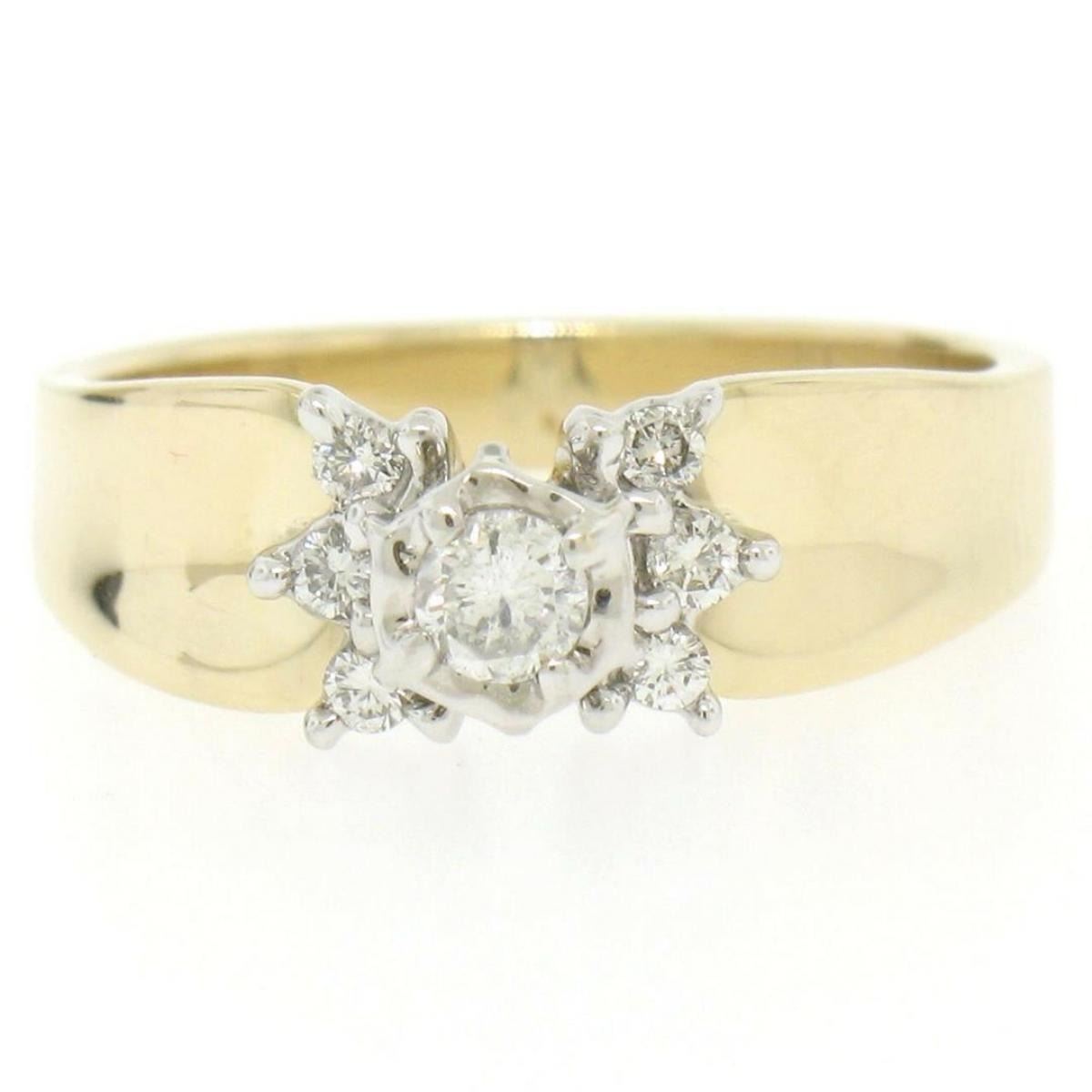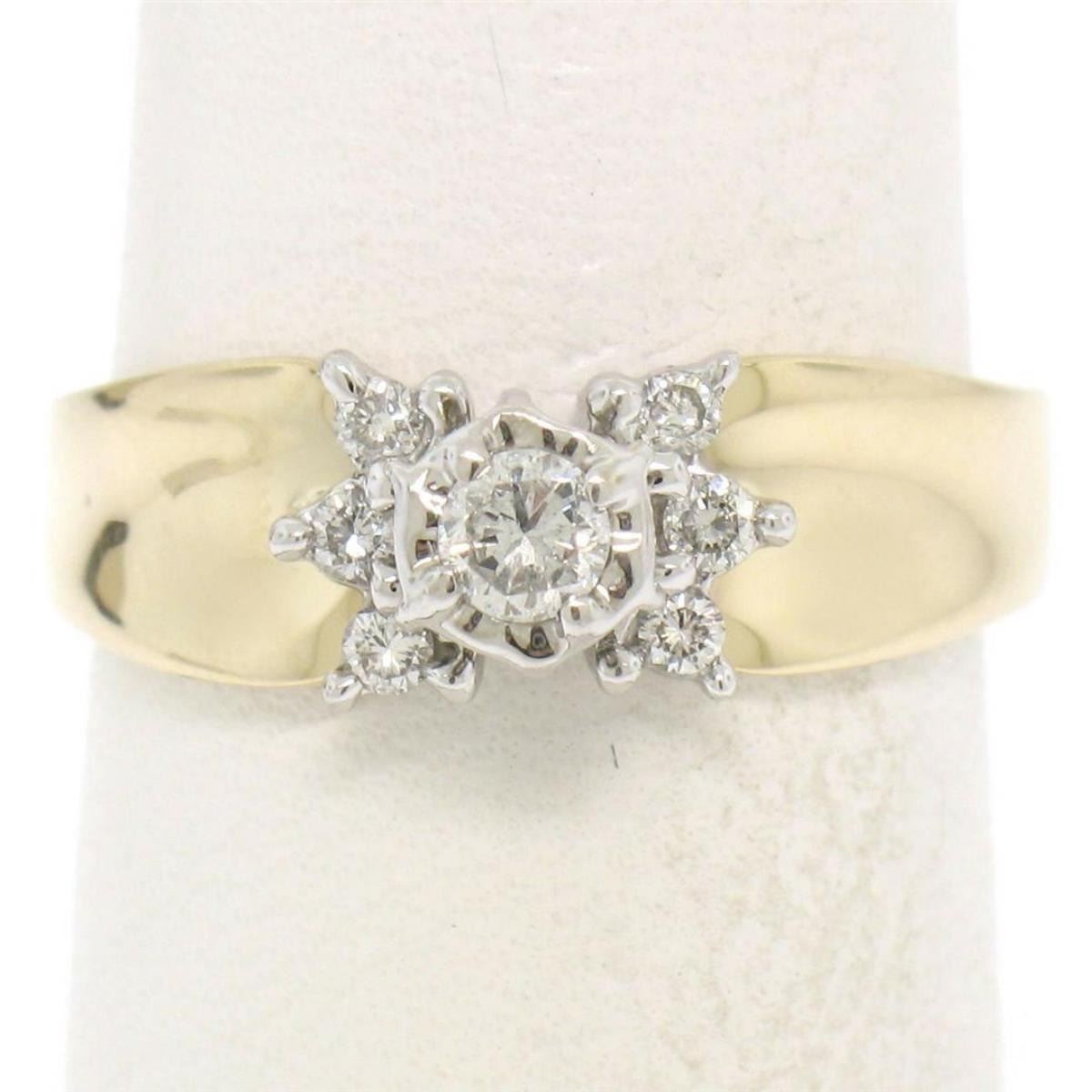 One 14k Two Tone Gold 0.30 ctw Illusion Set Solitaire Diamond Engagement Ring Size 7. Item Details: Material: 14K Solid Yellow & White Gold, Weight: 4.3 Grams, Stone(s): (1) Natural Genuine Diamond - Round Brilliant Cut - Illusion Prong Set - G Color - SI1 Clarity - 0.20 ct (approx.), (6) Natural Genuine Diamonds - Round Brilliant Cut - Prong Set - H Color - SI2 Clarity - 0.10 ctw (approx.), Total Carat Weight: 0.30 (approx.), Ring Size: 7.0, Ring Width: 6.52mm, Ring Height: 7.05mm rise off the finger, Condition: Like New!