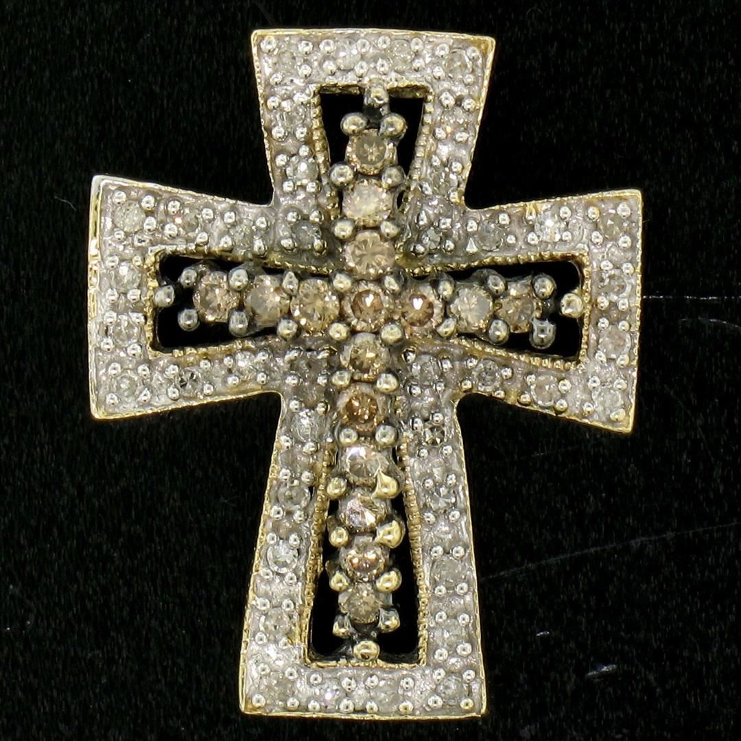 One 14k Two Tone Gold 1.00ctw Champagne & White Diamond Petite Cross Slide Pendant. Item Details: Material: 14K Solid White & Yellow Gold, Weight: 3.2 Grams, Stone(s): (40) Natural Genuine Diamonds - Round Brilliant Cut - Pavé Set - SI2/I1 Clarity - H/I Color, (16) Natural Genuine Diamonds - Round Brilliant Cut - Prong Set - SI1 Clarity - Champagne Color, Total Carat Weight: 1.00ctw (approx.), Chain Type: Not Included, Width: 18.20mm, Height: 22.85mm Thickness: 4.81mm, Bail Measurements: 2.32x3.65mm, Condition: Like New!