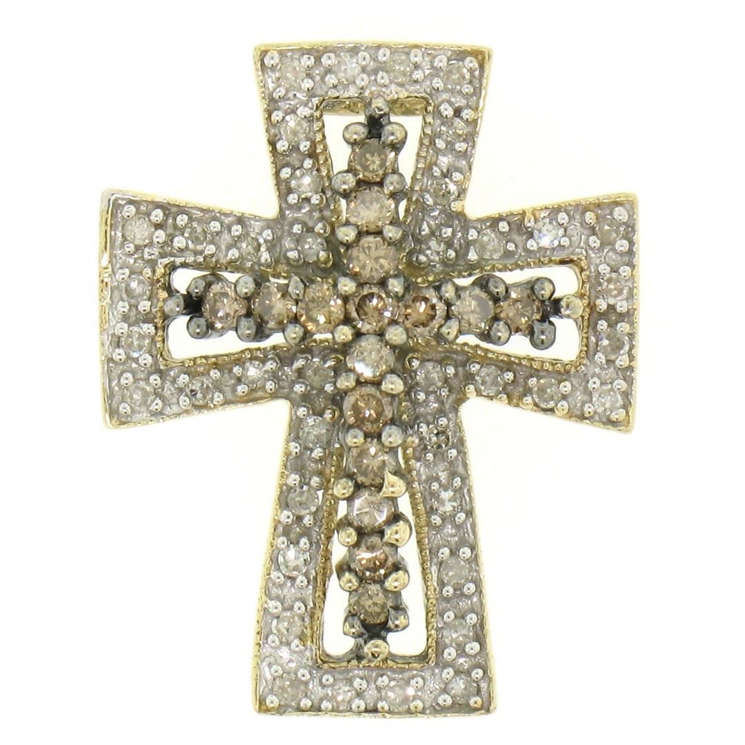One 14k Two Tone Gold 1.00ctw Champagne & White Diamond Petite Cross Slide Pendant. Item Details: Material: 14K Solid White & Yellow Gold, Weight: 3.2 Grams, Stone(s): (40) Natural Genuine Diamonds - Round Brilliant Cut - Pavé Set - SI2/I1 Clarity - H/I Color, (16) Natural Genuine Diamonds - Round Brilliant Cut - Prong Set - SI1 Clarity - Champagne Color, Total Carat Weight: 1.00ctw (approx.), Chain Type: Not Included, Width: 18.20mm, Height: 22.85mm Thickness: 4.81mm, Bail Measurements: 2.32x3.65mm, Condition: Like New!
