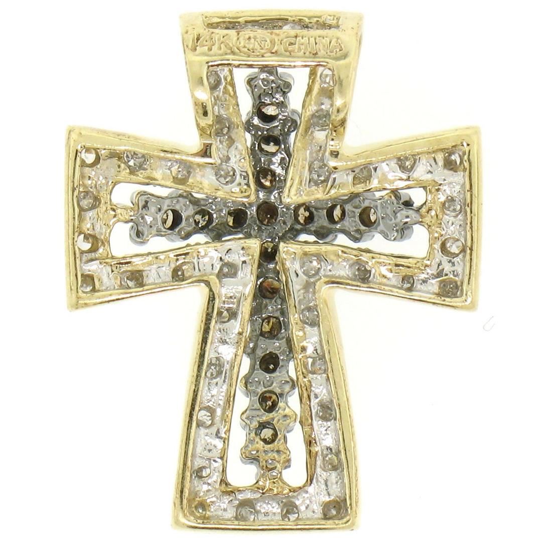 One 14k Two Tone Gold 1.00ctw Champagne & White Diamond Petite Cross Slide Pendant. Item Details: Material:  14K Solid White & Yellow Gold, Weight:  3.2 Grams, Stone(s):  (40) Natural Genuine Diamonds - Round Brilliant Cut - Pavé Set - SI2/I1 Clarity - H/I Color, (16) Natural Genuine Diamonds - Round Brilliant Cut - Prong Set - SI1 Clarity - Champagne Color, Total Carat Weight:  1.00ctw (approx.), Chain Type:  Not Included, Width:  18.20mm, Height:  22.85mm Thickness:  4.81mm, Bail Measurements:  2.32x3.65mm, Condition:  Like New!