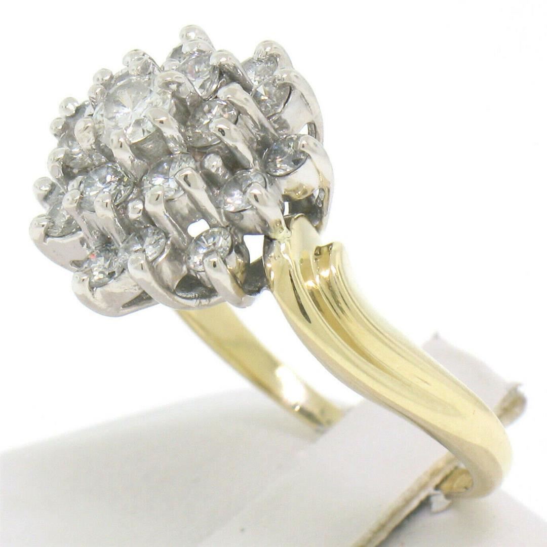An estate solid 14k white and yellow gold cluster ring, with 19 round brilliant cut natural diamonds (G/H - SI1/SI2 ; 1.1ctw). The ring is size 7.25, weighs a total of 5.40 grams, and measures 13.13mm wide.