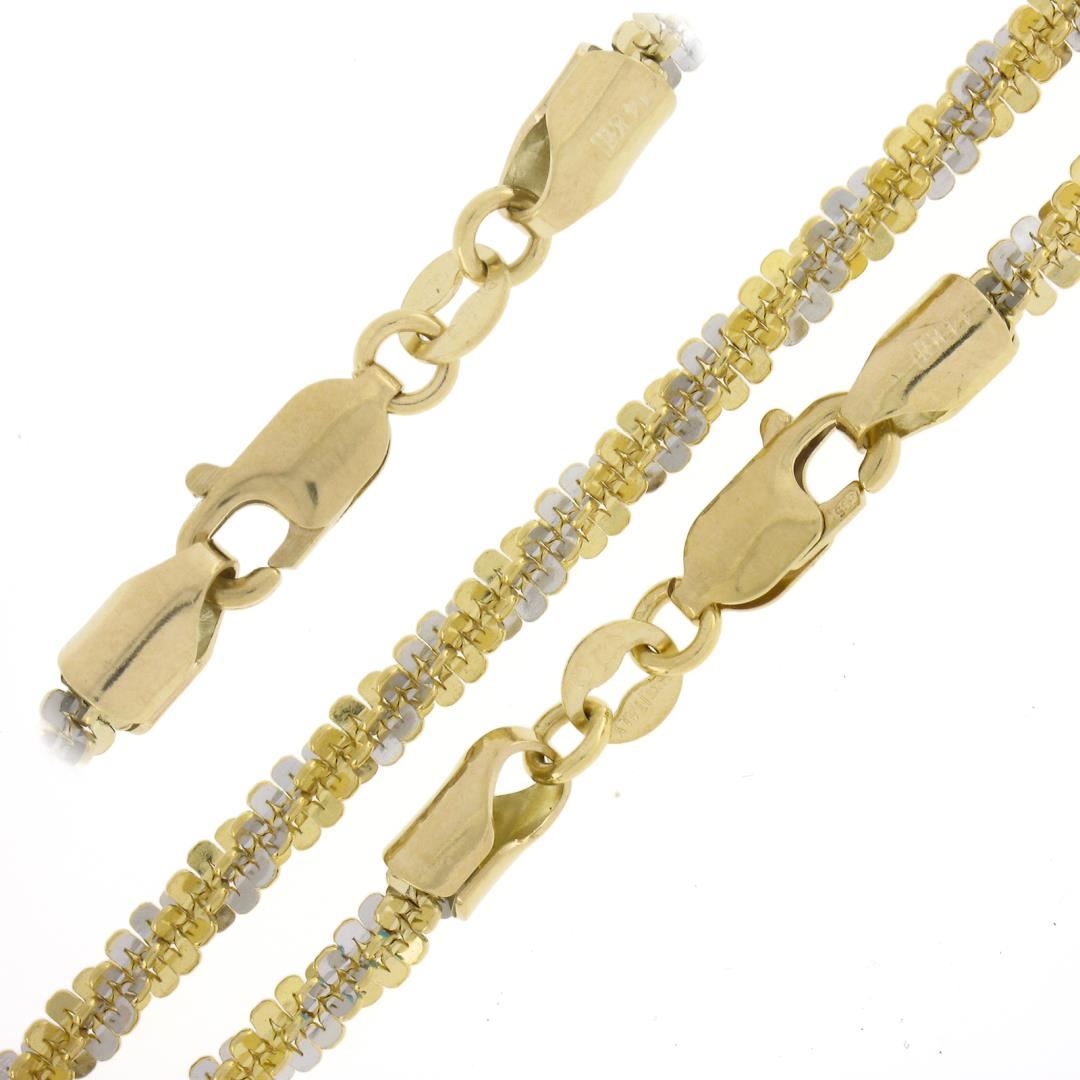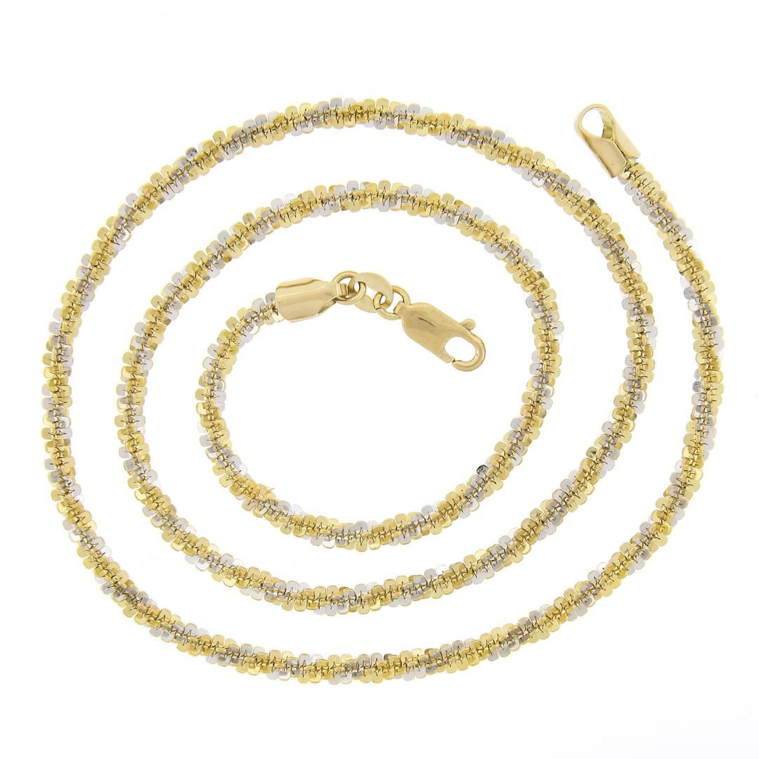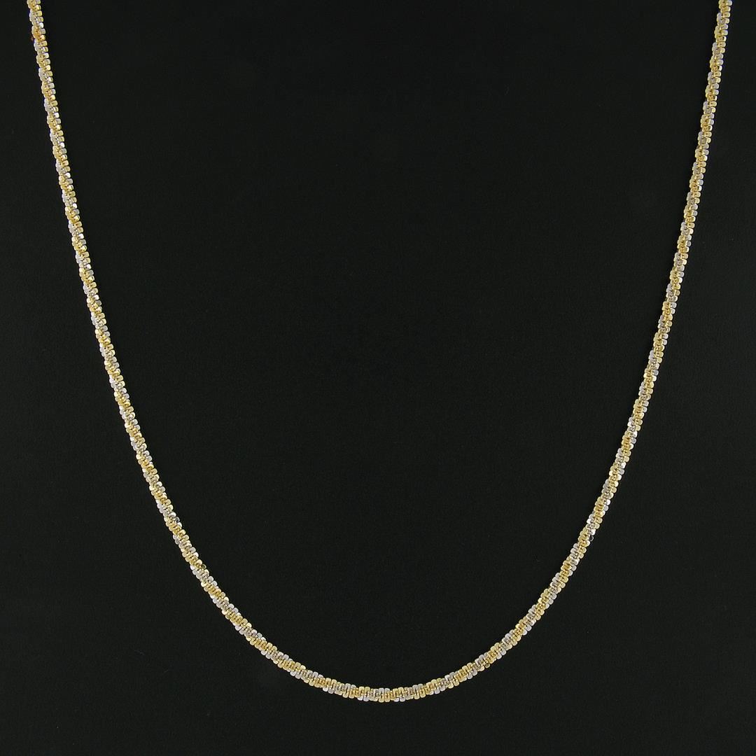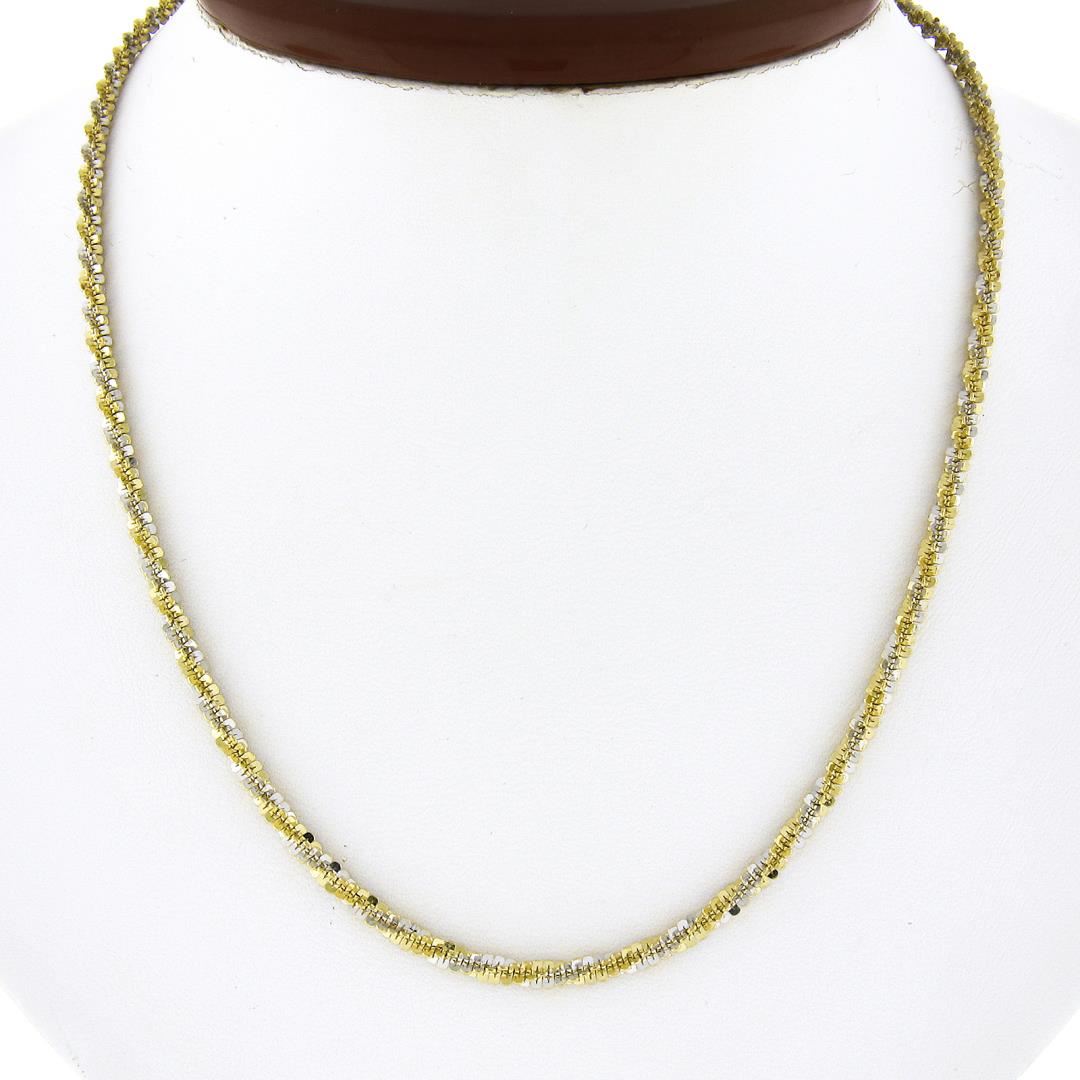 A solid 14k yellow & white gold twisted link necklace. It weighs a total of 11.55 grams, measures 3.1mm wide, and measures 17 inches in length.