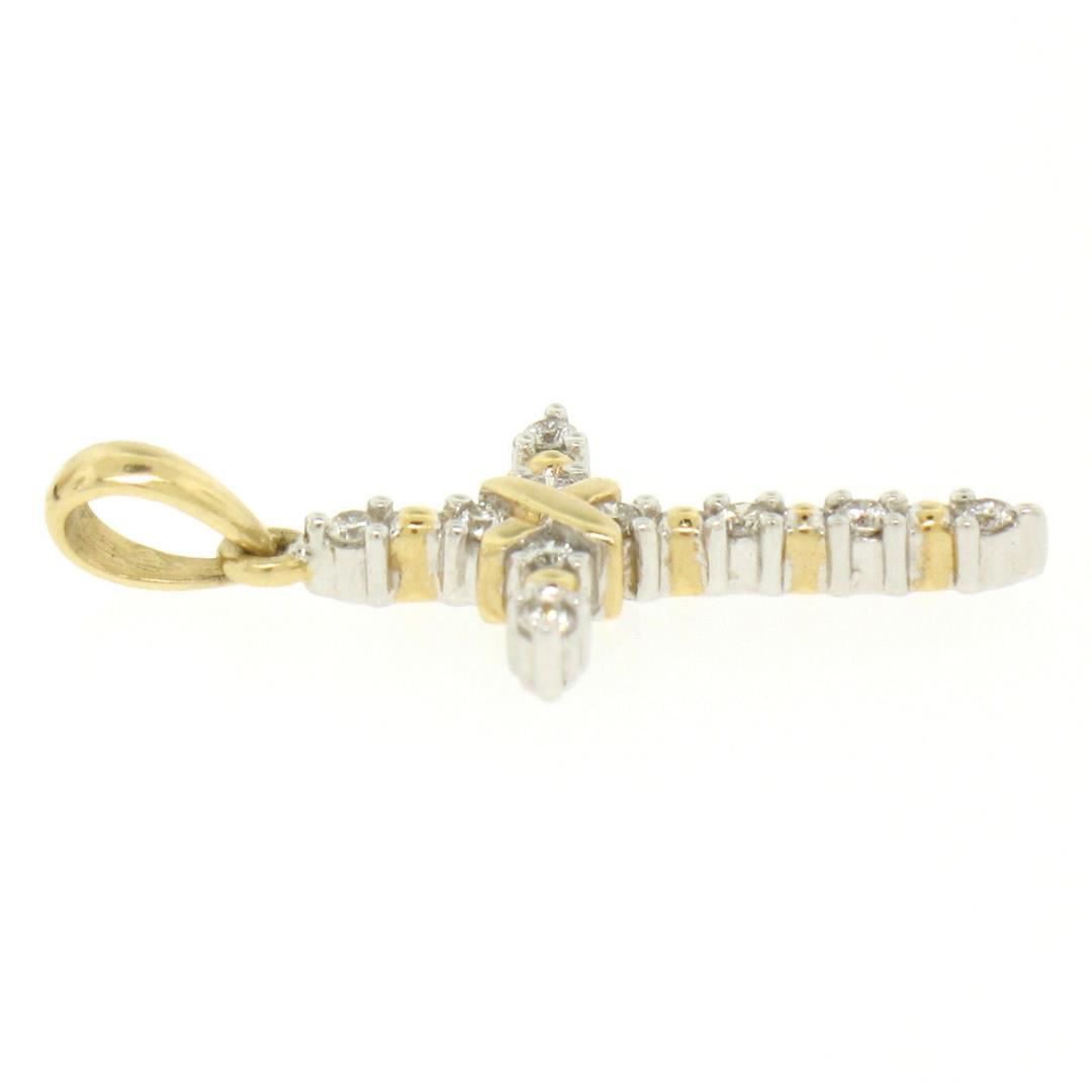 One 14k Two Tone Gold .20ctw Prong Set Round Brilliant Diamond Petite Cross Pendant. Item Details: Material: 14K Solid White & Yellow Gold, Weight: 1.10 Grams, Stone(s): (10) Natural Genuine Diamonds - Round Brilliant Cut - Prong Set - SI1 Clarity - G Color, Total Carat Weight: 0.20ctw (approx.), Chain Type: Not Included, Width: 11.96mm, Height (w/ Bail): 24.58mm, Height (w/o Bail): 20.10mm. Thickness: 2.64mm. Bail Measurements (Inside): 2.72x4mm. Condition: Like New!