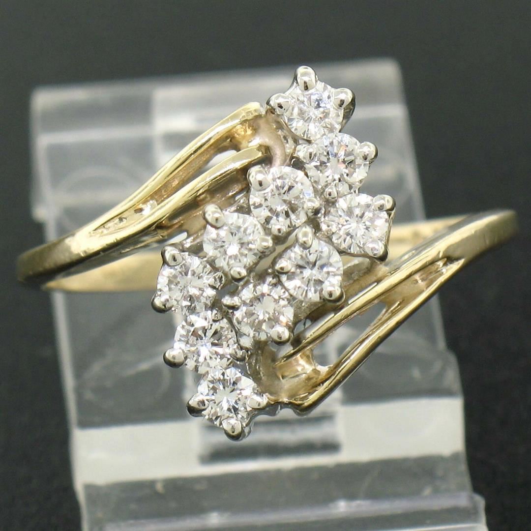 One 14k Two Tone Gold .52ctw Bypass Style Prong Set Diamond Wave Cluster Ring Sz 7.5. Item Details - Material: Solid 14k Yellow and White Gold, Weight: 3.1 Grams, Stone(s): (10) Natural Genuine Diamonds - Round Brilliant Cut - Prong Set - VS1/VS2 Clarity - F/G Color, Total Carat Weight: 0.52 (stamped), Ring Size: 7.5 , Ring Width: 14.8mm, Ring Height: 7.65mm rise off the finger, Condition: Estate piece. Like New!