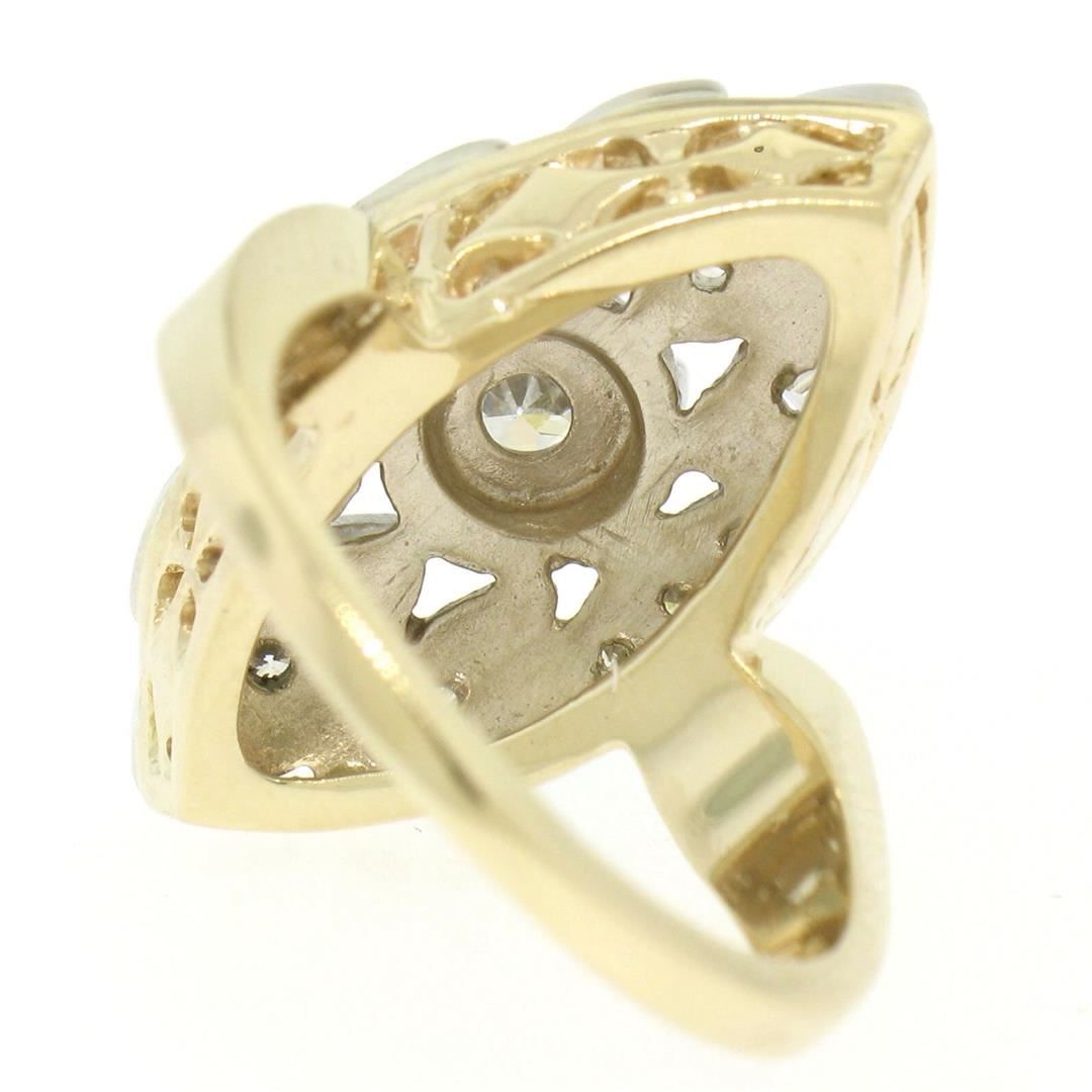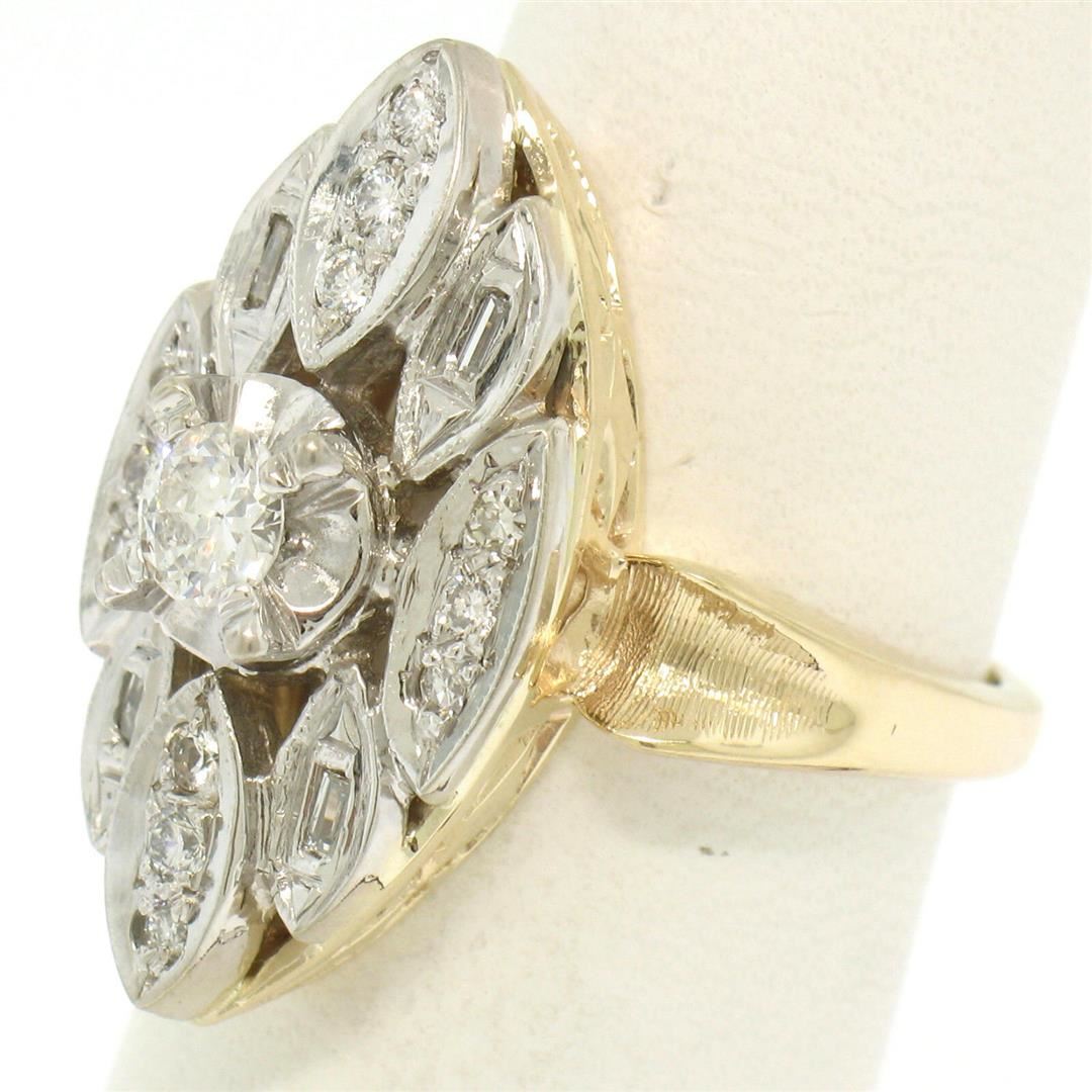 One Vintage Marquise Shaped 14k Two Tone Gold 0.55ctw European Cut Diamond Solitaire Ring. Item Details: Material: 14k Solid Yellow and White Gold, Weight: 8.5 Grams, Stone(s): (1) Natural Genuine Diamond - Round European Cut - Illusion Prong Set - F Color - SI1 Clarity - 0.33ct (approx.), (4) Natural Genuine Diamonds - Round Single Cut - Pavé Set - G Color - VS2/SI1 Clarity - 0.04ctw (approx.), (8) Natural Genuine Diamonds - Round Full Cut - Pavé Set - G Color - VS2/SI1 Clarity - 0.10ctw (approx.), (4) Natural Genuine Diamonds - Straight Baguette Cut - Bezel Set - G/H Color - VS2-SI2 Clarity - 0.08ctw (approx.), Total Carat Weight: 0.55 (approx.), Ring Size: 6.25 (We can custom size this ring.) Ring Width: 23.67mm Ring Height: 8.47mm rise off the finger Condition: Vintage piece. Excellent, ready to wear condition!