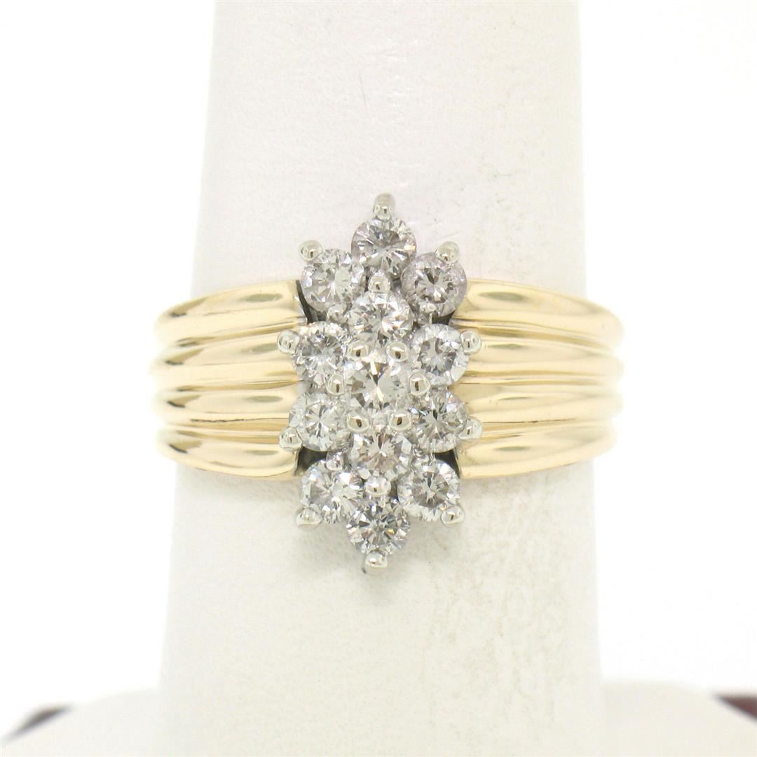 One 14k Two Tone Gold Diamond .85ct Round G VS Diamond Elongated Ribbed Cluster Ring. Item Details: Material: 14K Solid Yellow & White Gold, Weight: 6.6 Grams, Stone(s): (13) Natural Genuine Diamonds - Round Brilliant Cut - Prong Set - G/H Color - VS2 Clarity, Total Carat Weight: 0.85ctw (approx.), Ring Size: 8 , Ring Width: 15.80mm, Ring Height: 5.85mm rise off the finger, Condition: Like New!