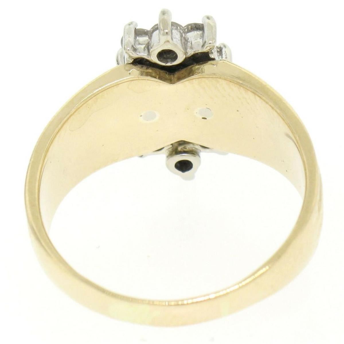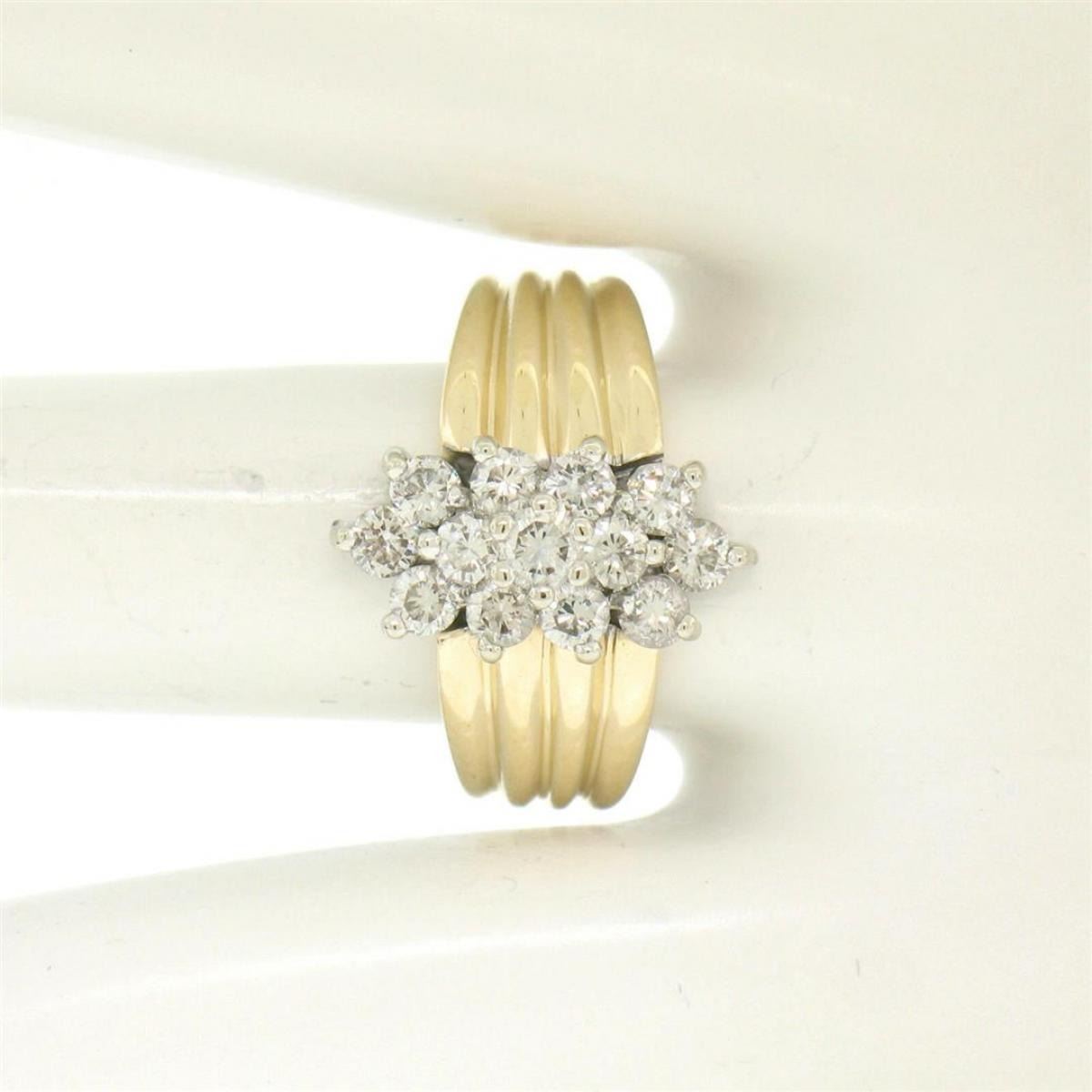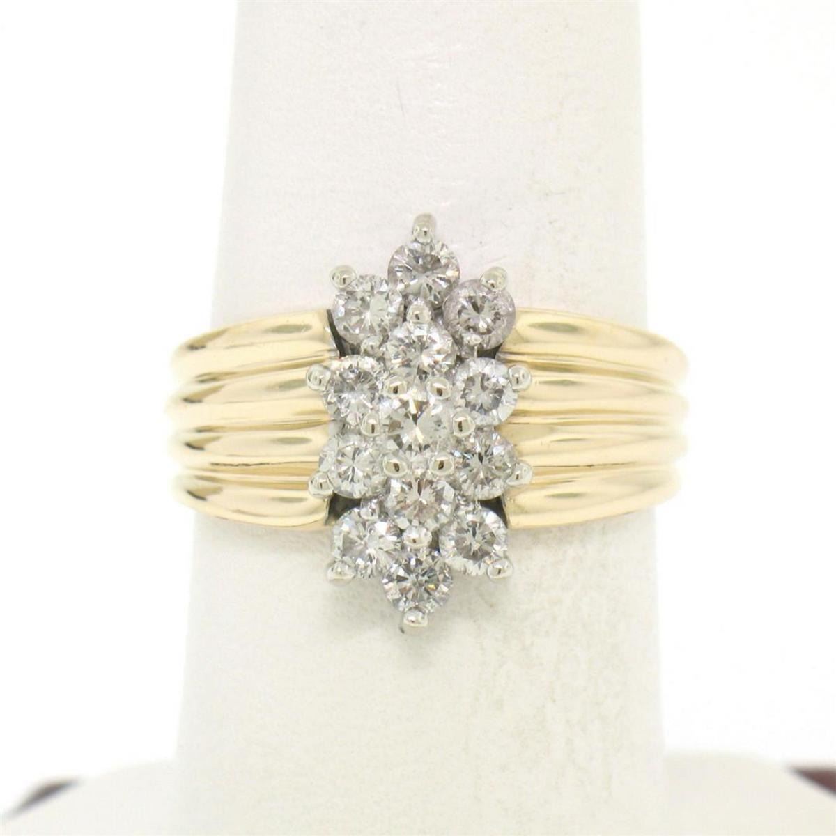One 14k Two Tone Gold Diamond .85ct Round G VS Diamond Elongated Ribbed Cluster Ring. Item Details: Material: 14K Solid Yellow & White Gold, Weight: 6.6 Grams, Stone(s): (13) Natural Genuine Diamonds - Round Brilliant Cut - Prong Set - G/H Color - VS2 Clarity, Total Carat Weight: 0.85ctw (approx.), Ring Size: 8 , Ring Width: 15.80mm, Ring Height: 5.85mm rise off the finger, Condition: Like New!