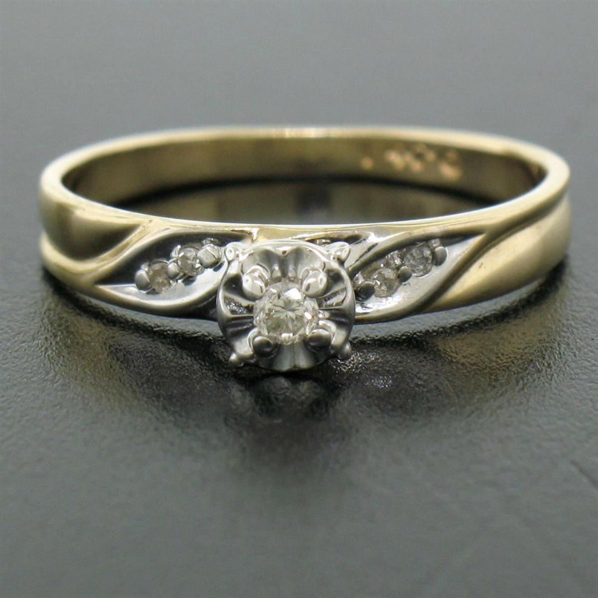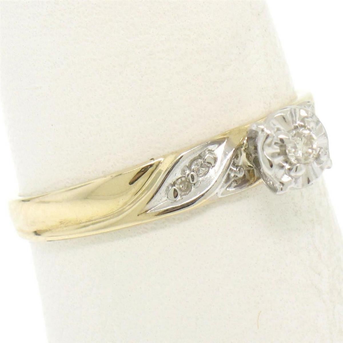 One Vintage 14k Two Tone Gold Illusion Prong Set Transitional Diamond Solitaire Ring. Item Details: Material: 14k Solid Yellow and White Gold, Weight: 2.10 Grams, Stone(s): (1) Natural Genuine Diamond - Round Transitional Cut - Illusion Prong Set - SI2 Clarity - H Color, (4) Natural Genuine Diamond - Round Single Cut - Prong Set - SI2 Clarity - H Color, Total Carat Weight: 0.10 (approx.), Ring Size: 7.5, Ring Width: 3.65mm, Ring Height: 6.08mm rise off the finger. Condition: Vintage piece. Excellent condition!